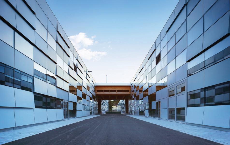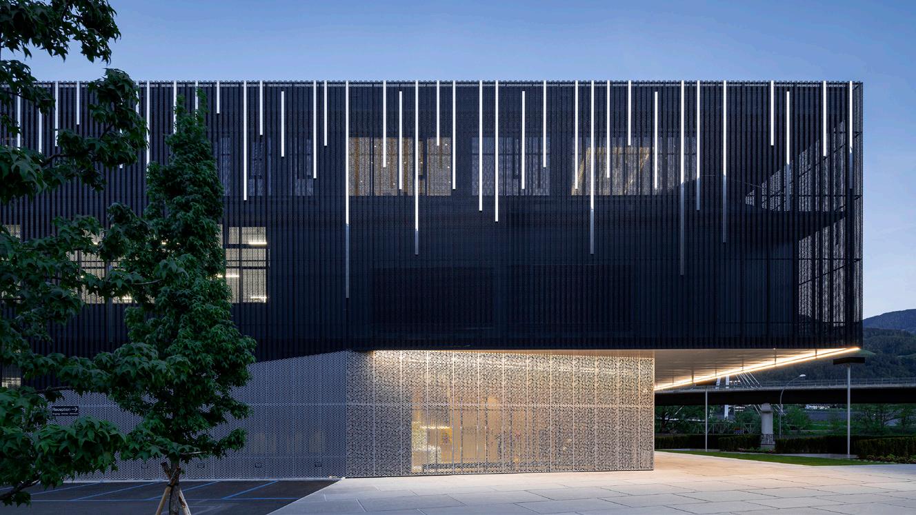 In the Algo Shopping Centre in Lagundo, we created 7,000 m²of exterior aluminium slat cladding, 400 m² of glazed facades , 430 m² of aluminium sheet cladding for the entrance canopies with a steel substructure, and 3,000 m² of interior steel slat ceilings. Noteworthy are the continuous changes in inclination in three directions, and the overlapping of cladding to simulate draping around the building.