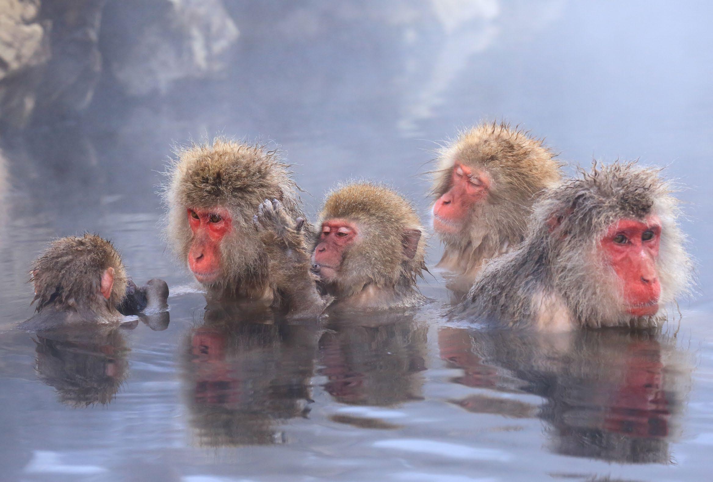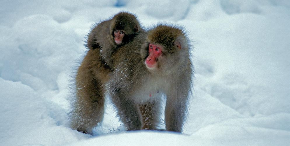 Un esemplare femmina di macaco giapponese (Macaca fuscata) che porta sulla schiena il cucciolo, Isola Hokkaido in Giappone; slowmotiongli/iStock.
