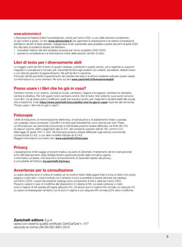 La garanzia di aggiornamento è limitata alla correzione degli errori e alla eliminazione di malfunzionamenti presenti al momento della creazione dell’opera. Zanichelli garantisce inoltre che le risorse digitali di questo volume sotto il suo controllo saranno accessibili, a partire dall’acquisto, per tutta la durata della normale utilizzazione didattica dell’opera. Passato questo periodo, alcune o tutte le risorse potrebbero non essere più accessibili o disponibili: per maggiori informazioni, leggi my.zanichelli.it/fuoricatalogo