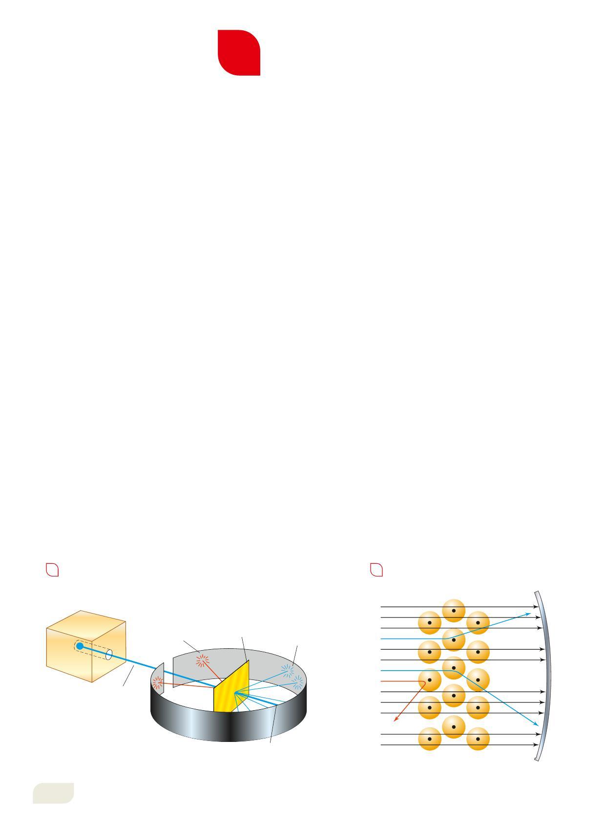 (A) L’esperimento di Rutherford, in cui le particelle alfa positive (a) emesse da una sorgente radioattiva venivano inviate su una sottile lamina d’oro. (B) La deviazione delle particelle a da parte dei nuclei positivi degli atomi d’oro.