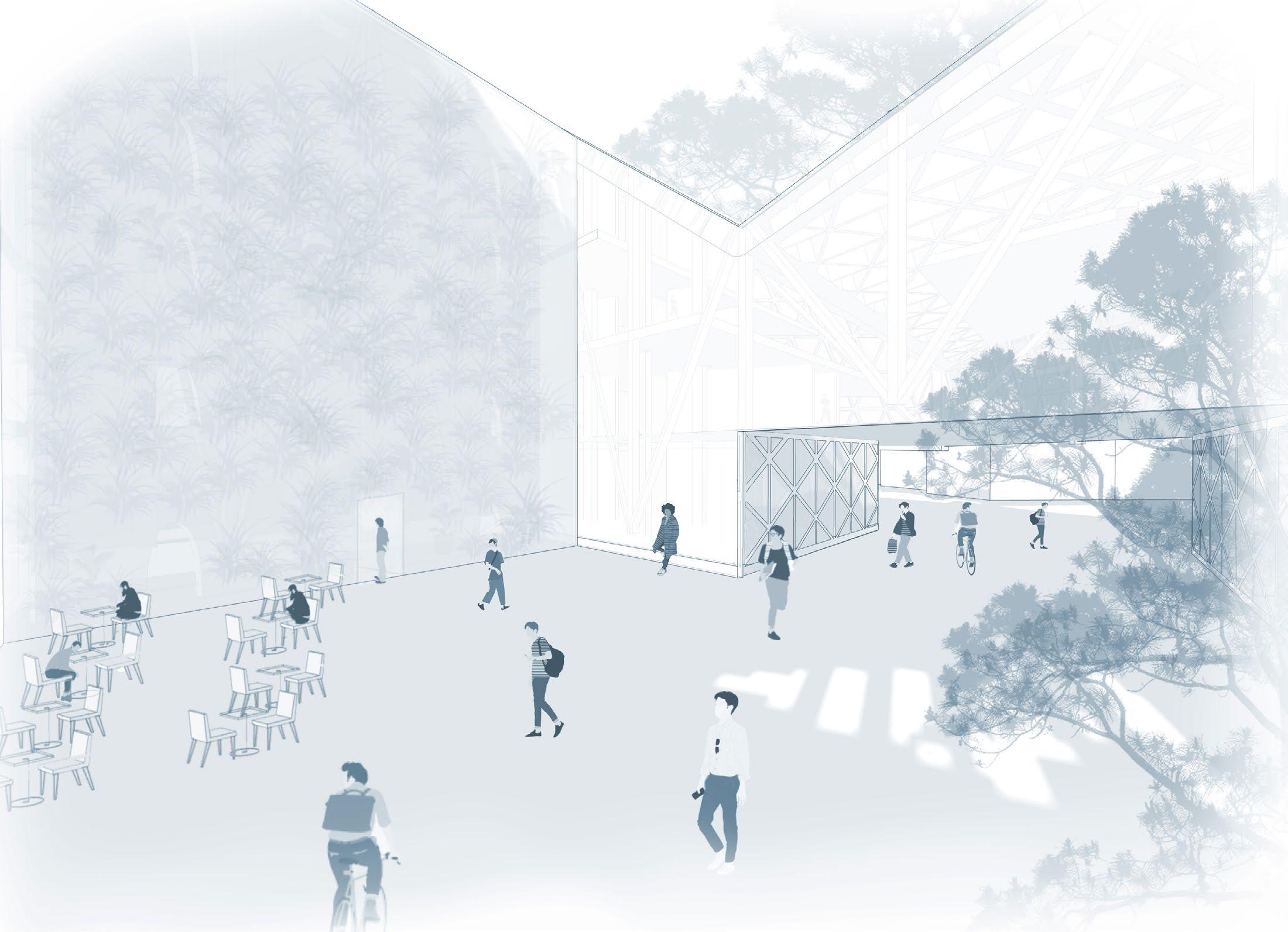 The Climatorium is designed to act as a system that utilizes light and water as reusable elements. The building harnesses these elements through the language of its form, adapting a steep roofline to promote the movement of water and position light to hit the building. Special moments are created to visualize these elemental interventions, such as the vertical garden for growth, the aperture of the skylights in the roof, and the transparencies that are played with to visualize all its functions. The climatorium also uses double glazing and aerogel as an insulating feature in the interior spaces to allow light to diffuse through the building and reduce heat loss in the winter. The building’s two structural systems have cantilevers on opposite ends to create a welcoming public space on the ground level. To achieve these large spans, steel trusses are used on the ends of the building and CLT columns towards the center are situated to reduce the embodied carbon of the metal material. All the beams and floor slabs utilize CLT and they account for a majority of the material reuse in the building.