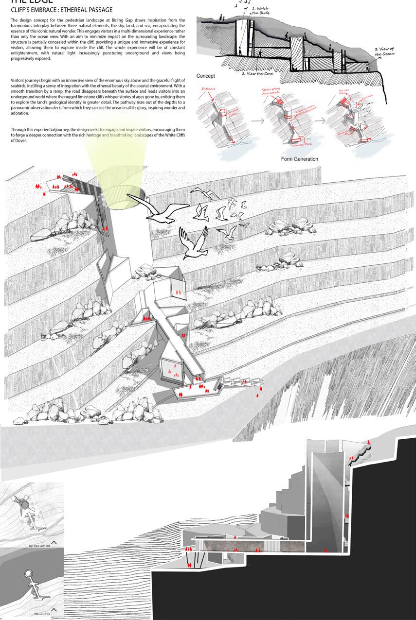 The design concept for the pedestrian landscape at Birling Gap draws inspiration from the harmonious interplay between three natural elements, the sky, land, and sea, encapsulating the essence of this iconic natural wonder. This engages visitors in a multi-dimensional experience rather than only the ocean view. With an aim to minimize impact on the surrounding landscape, the structure is partially concealed within the cli , providing a unique and immersive experience for visitors, allowing them to explore inside the cli The whole experience will be of constant enlightenment, with natural light increasingly puncturing underground and views being progressively exposed.