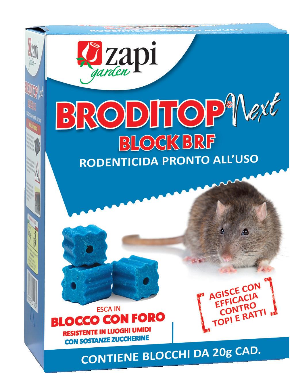 Lotta contro: topolino domestico e ratto grigio. Modalità d’uso: Per il controllo del Topo domestico: Utilizzare fino a 50 g di esca per contenitore e posizionare quest’ultimi ad una distanza di 5 m l’uno dall’altro. Ridurre tale distanza a 2 metri in caso di forte infestazione. Per il controllo del Ratto grigio - Uso all’interno ed intorno agli edifici: Utilizzare fino a 90 g di esca per contenitore e posizionare quest’ultimi ad una distanza di 10 m l’uno dall’altro. Ridurre tale distanza a 5 metri in caso di forte infestazione. Per garantire la massima sicurezza e la massima efficacia, utilizzare contenitori specifici per esche topicide Zapi tipo “Bait Station” o “T-Dispenser”.