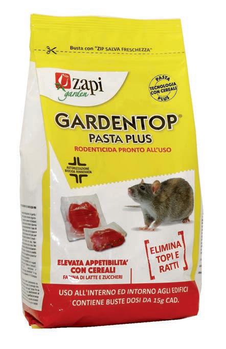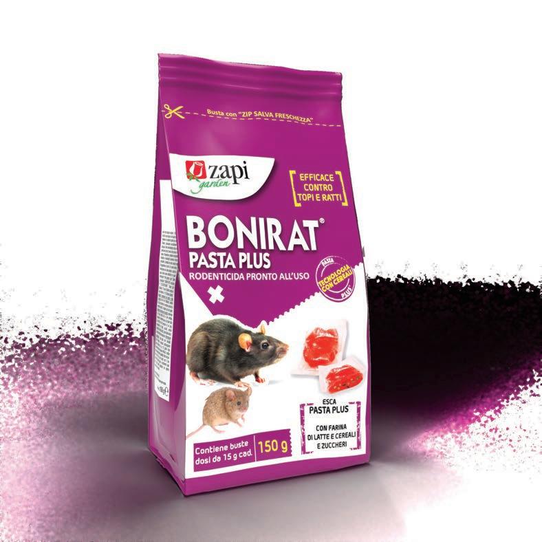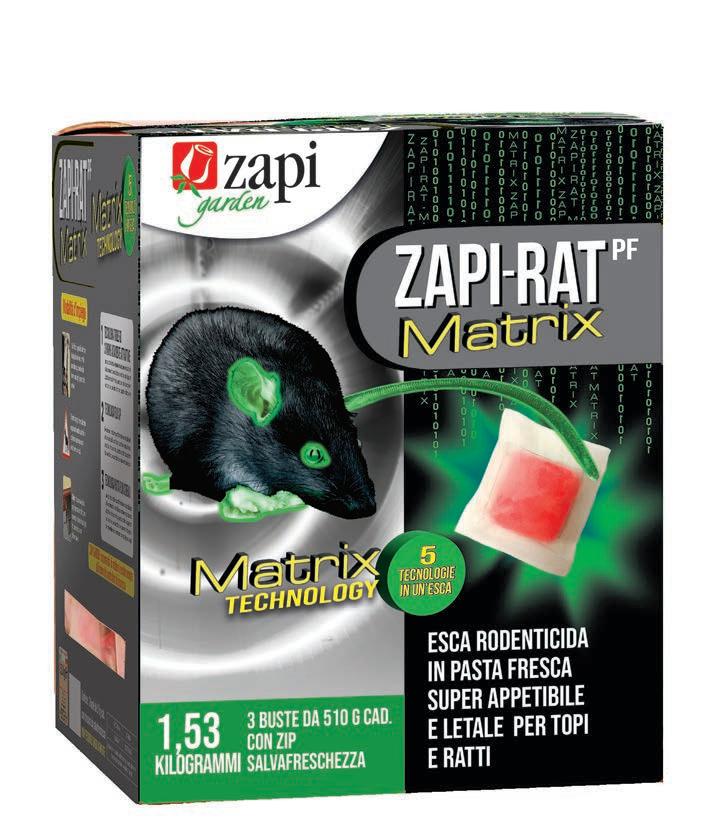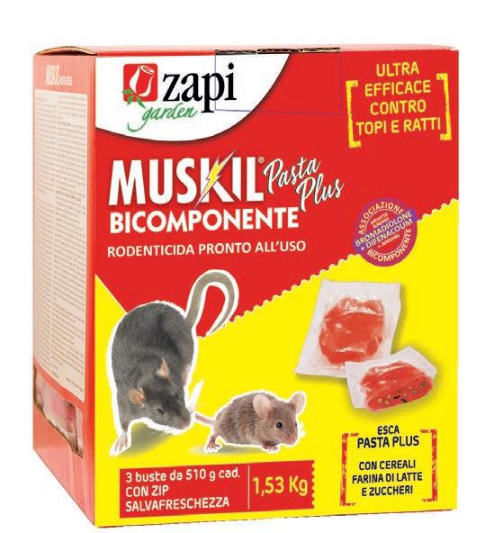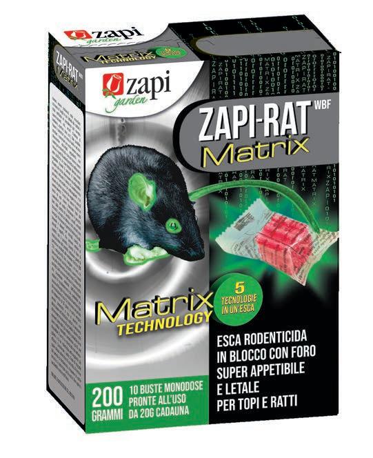 Dosi e frequenza d’impiego: Per il controllo del Topo domestico (Mus musculus) - Uso all’interno ed esterno intorno agli edifici: - 30-50 g di prodotto per contenitore ogni 2-5 metri. Per il controllo di ratti (Rattus norvegicus e Rattus rattus) - Uso all’interno ed esterno intorno agli edifici: - 60-80 g di prodotto per contenitore ogni 5-10 metri. Per garantire la massima sicurezza e la massima efficacia, utilizzare contenitori specifici per esche rodenticida Zapi tipo “Bait Station” o “T-Dispenser”.