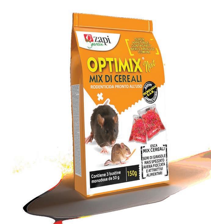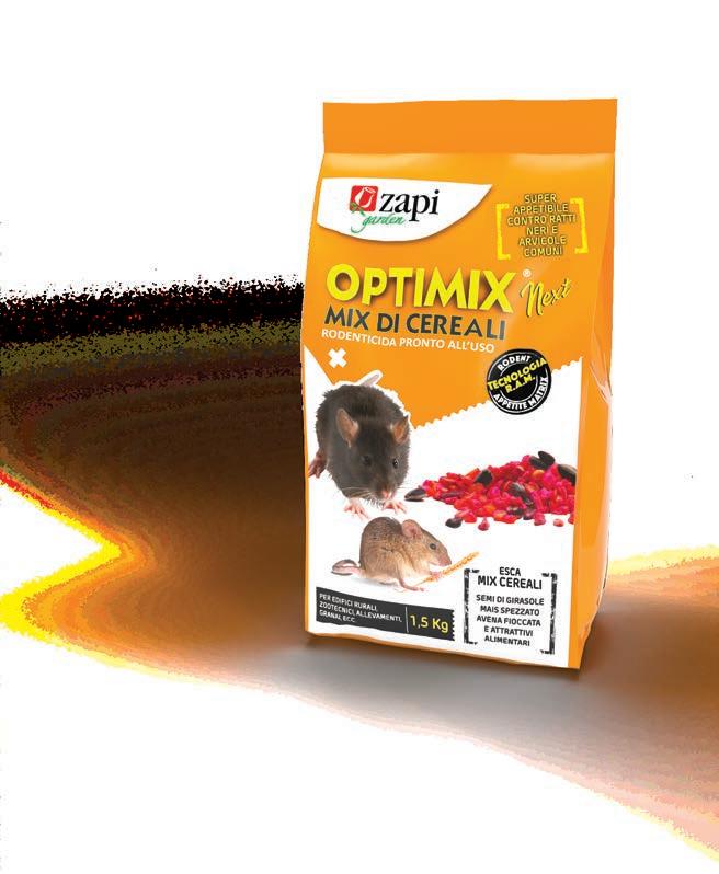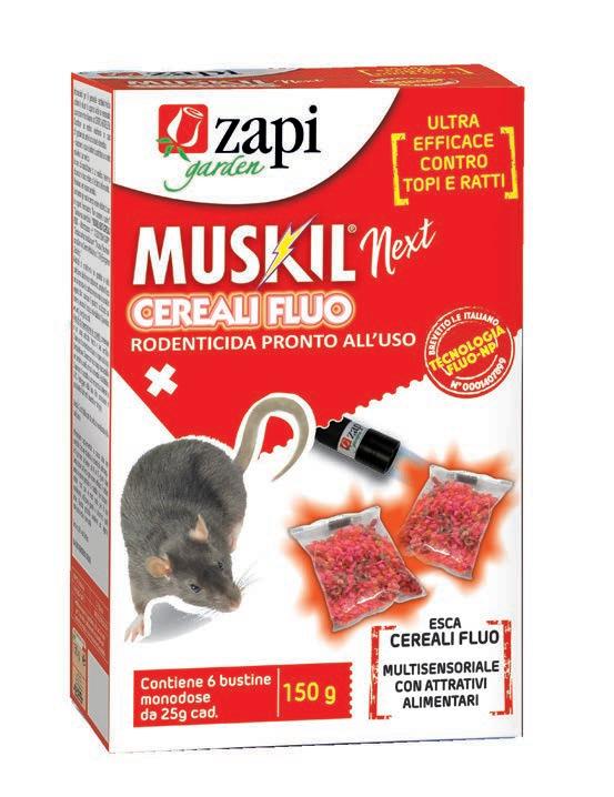 Formato dell’esca: a base di una miscela di granaglie sfusa. Lotta contro: per il controllo totale delle infestazioni dei roditori (ratti, topi domestici ed arvicole comuni) in tutte le fasi di sviluppo. Indicato per: edifici rurali con stoccaggio di cereali, granai, allevamenti, ecc. ed in aree sensibili civili e industriali (produzione di mangimi, lavorazioni di farine, mulini, ecc.).