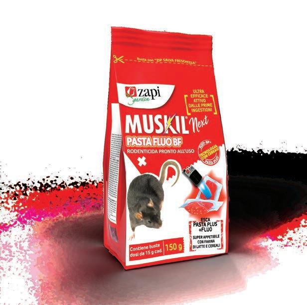 Formato dell’esca: pasta rossa fluo. Lotta contro: topi domestici, ratti grigi e ratti neri. Indicato per: utilizzato all'interno e intorno a edifici rurali, civili e industriali (inclusi magazzini, depositi, stive di navi), abitazioni, cantine, garage, ripostigli. Può essere applicato anche all'interno di impianti di distribuzione di energia e mezzi di trasporto.