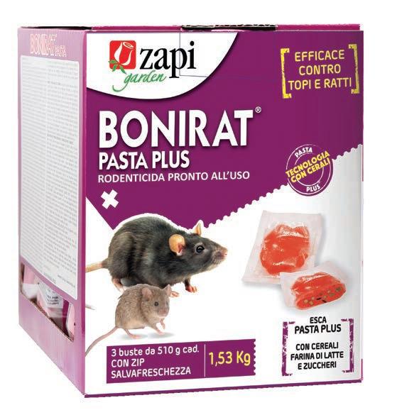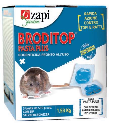 Dosi e frequenza d’impiego: Per il controllo del Topo domestico (Mus musculus) - Uso all’interno: - 30-50 g di prodotto per contenitore ogni 2-5 metri. Per il controllo di ratti (Rattus norvegicus e Rattus rattus) - Uso all’interno ed esterno intorno agli edifici: - 75-100 g di prodotto per contenitore ogni 5-10 metri.Per garantire la massima sicurezza e la massima efficacia, utilizzare contenitori specifici per esche rodenticida Zapi tipo “Bait Station” o “T-Dispenser”.