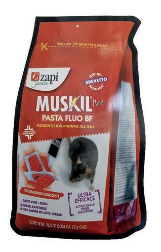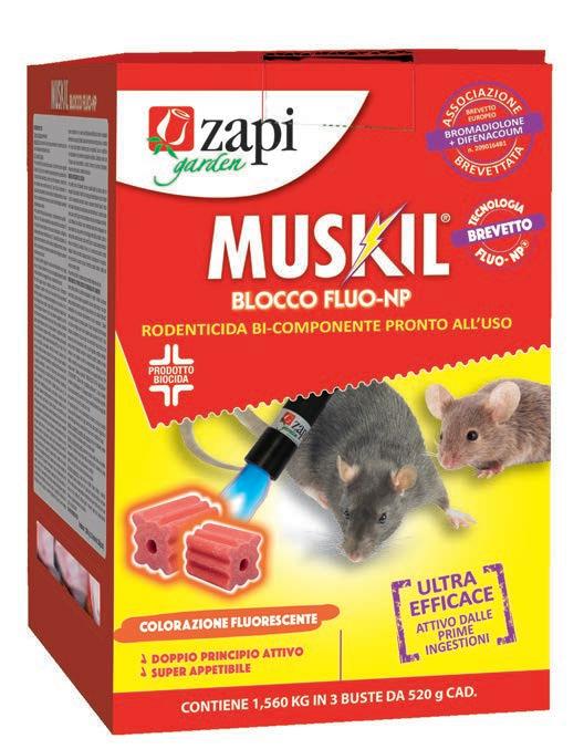 (*) Tecnologia visiva FLUO-NP: uno speciale additivo che rende sia l'esca sia gli escrementi dei roditori che se ne cibano facilmente identificabile anche in condizioni di scarsa illuminazione, i quali risultano visibili sotto una luce UV. Puntando una lampada UV portatile (luce nera) sugli escrementi dei roditori è facile identificarne e tracciarne il movimento