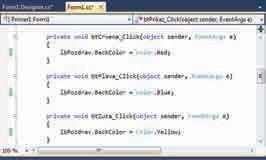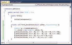 long, 60 Main, 37 MouseClick, 36, 45 MouseDown, 27, 45 MouseMove, 45 MouseUp, 27, 45 Name, 41 Next, 49 Paint, 28,45 Panel, 118 Pen, 28, 36, 53 PictureBox, 40, 55 Point, 53 Properties, 33, 35, 47 RadioButton, 40, 115 Random, 49 Read, 167 ReadLine, 167 Remove,90 Resize, 46 SolidBrush, 28, 34 Solution Explorer, 33 StartsWith, 90 StreamReader, 166 StreamWriter, 166 string, 60, 89 Substring, 89 System именски простор , 34 System.Drawing – именски простор, 34 System.IO – именски простор, 166 Text, 41 TextBox, 40, 82 Tick, 49, 52 Timer, 49, 56 ToLower, 90 Toolbox, 33, 39 ToString, 78 ToUpper, 90 try-catch, 83 uint, 60 using директива , 34 while циклус, 140 Write, 167 WriteLine, 167