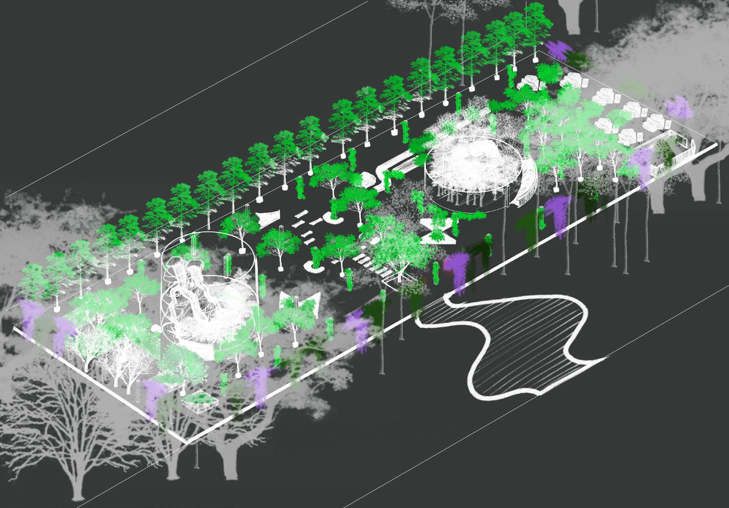 Design ExplanationThis project is designed for not only to heal the site but also to heal the people When they start to go in side this building,they can feel like in a forest Seeing and listening. There are a lot of healing area like cafe and reading Touching colour, adult colouring, pavilion and bridge which is connecting