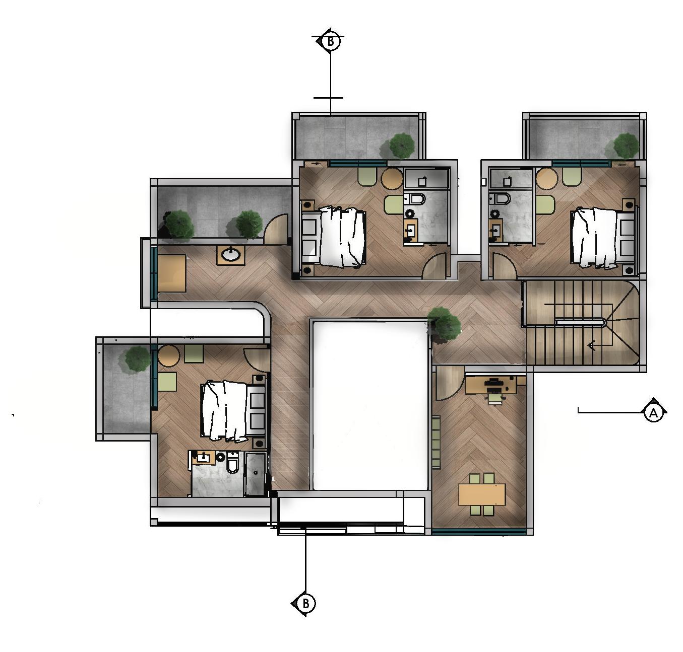 In ground floor, I designed like a mini forest with changing floor level, small lake and interior gardens for relaxing and calming their mind, reducing stress and temperature. Walls near the living and dinning room are covered with glasses. So, they can also feel outside environment, nature and sunrise.
