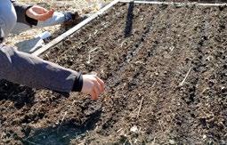 Po dolžini grede pripravimo sadilne jarke globine okoli 2 cm (v kompost malenkost globlje). Jarke izdatno zalijemo (tudi februarja) z vrtno zalivalko brez razpršilca. V roko si natresemo večjo količino semena, ga s prsti druge roke zajamemo ter sejemo tako, da ga rahlo spuščamo med prsti. Idealno je, da seme pade na približno vsakih 2 do 5 cm, a pri ročni setvi vedno sejemo bolj na gosto. Gosto setev lahko redčimo kasneje, le porabili smo (pre)več semen. Jarke zagrnemo in povrhu nič ne zalivamo. Vse vrste ali celo površino pohodimo, da semena dobijo stik z zemljo oz. s kompostom. Brez skrbi, semen ne bomo poškodovali.