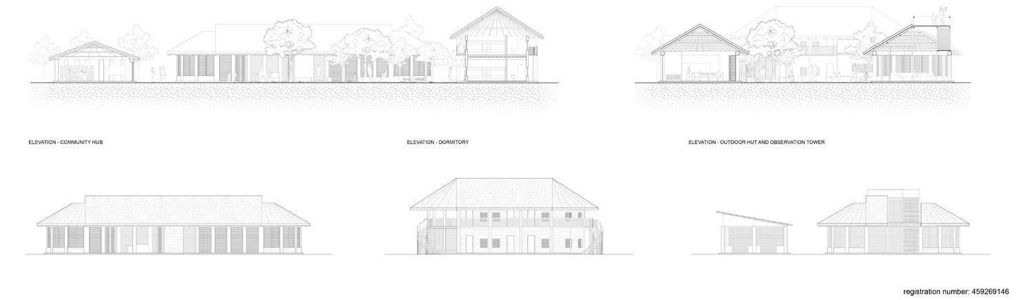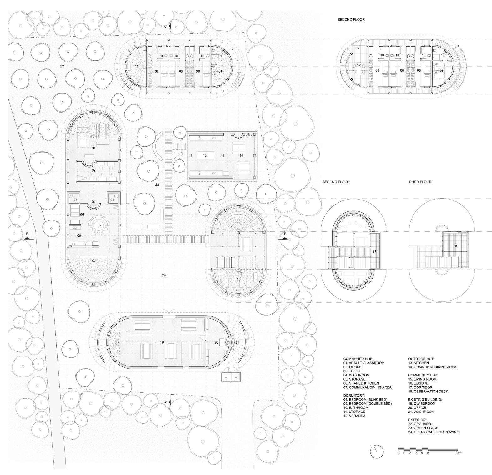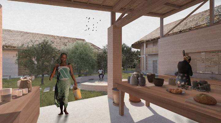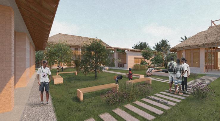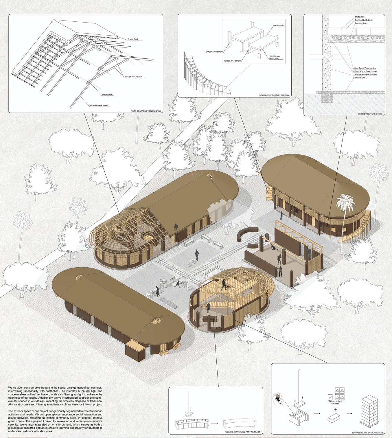 The Earthen Tribe, is an Educational Center locate on the beach, designs to draw inspiration from traditional African communities, creating educational spaces within nature using earth, wood, and vegetation. This concept filters out artificial elements, fostering a natural and sheltered learning environment. New buildings integrate seamlessly with existing classrooms, emphasizing material use, construction, and cultural identity. Sustainable materials like concrete rammed earth, wood, and thatch roofs are used for easy construction. The design promotes penetration and filtration, enhancing spatial openness and ventilation. The exterior spaces include gathering areas, green yards, and orchards for both kids and adults to enjoy a simple and relaxed atmosphere while connecting with nature and loved ones.