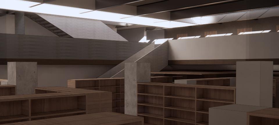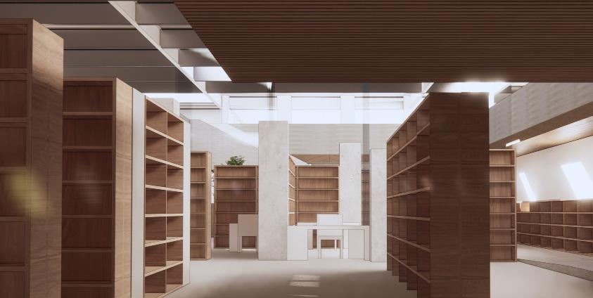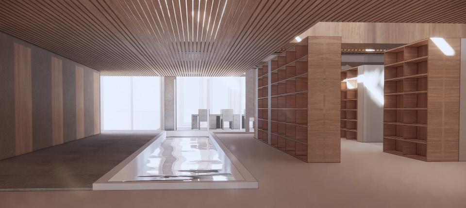 The bookshelf surrounds the user, creating a monastic-like environment where scholars live surrounded by books, immersing themselves in study and reflection. This provides a quiet and enlightening experience. The space is enhanced by three clusters of skylights above, allowing indirect natural light to gently fill the room.