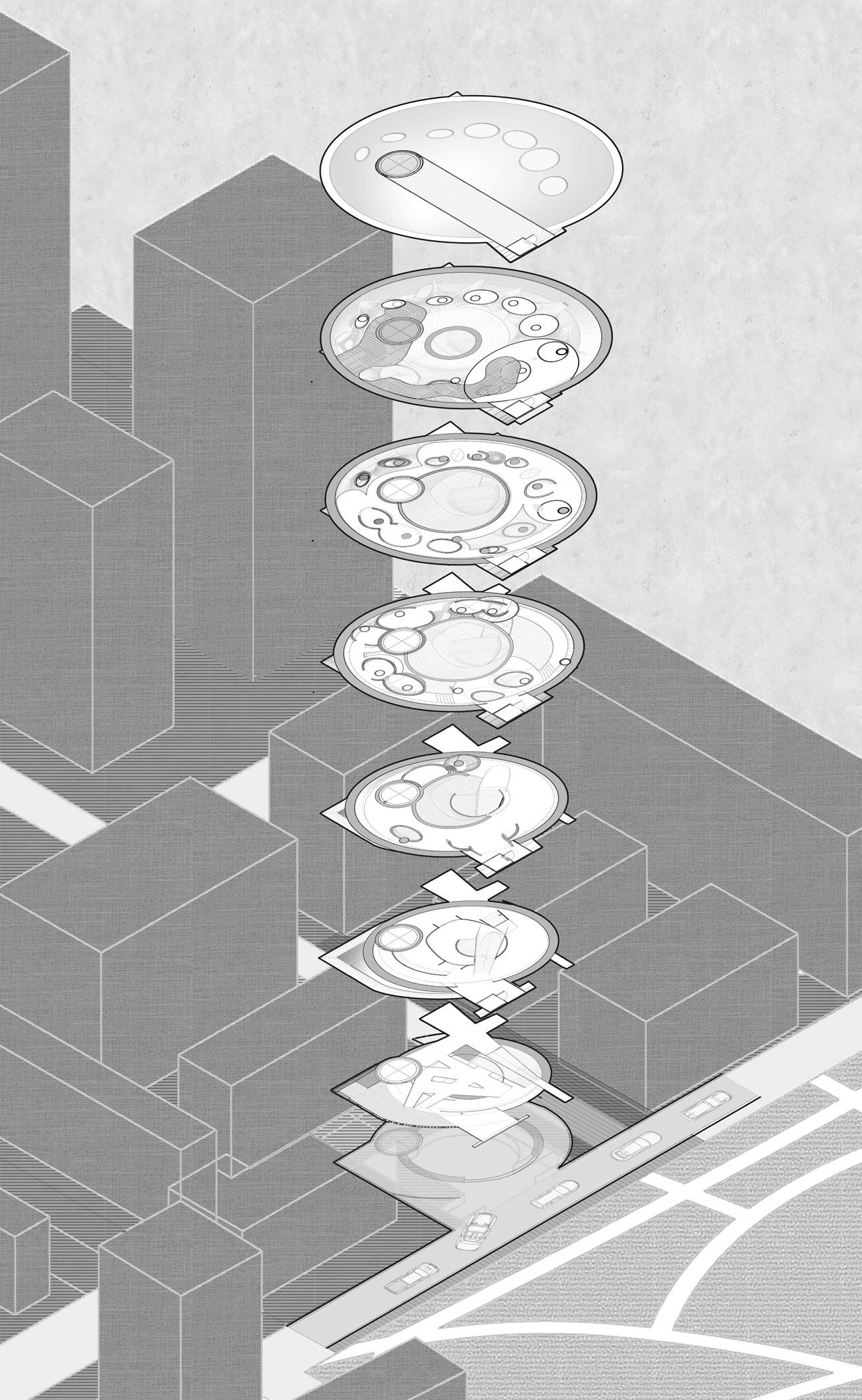 Based on a conceptual framework consisted by three basic geometrical forms, a spatial model that is designed to establish a set of relationships and/or formal strategies. Throughout the model that will extend to an exploration of part-towhole relationships at the scale of the detail, the building, and the city.