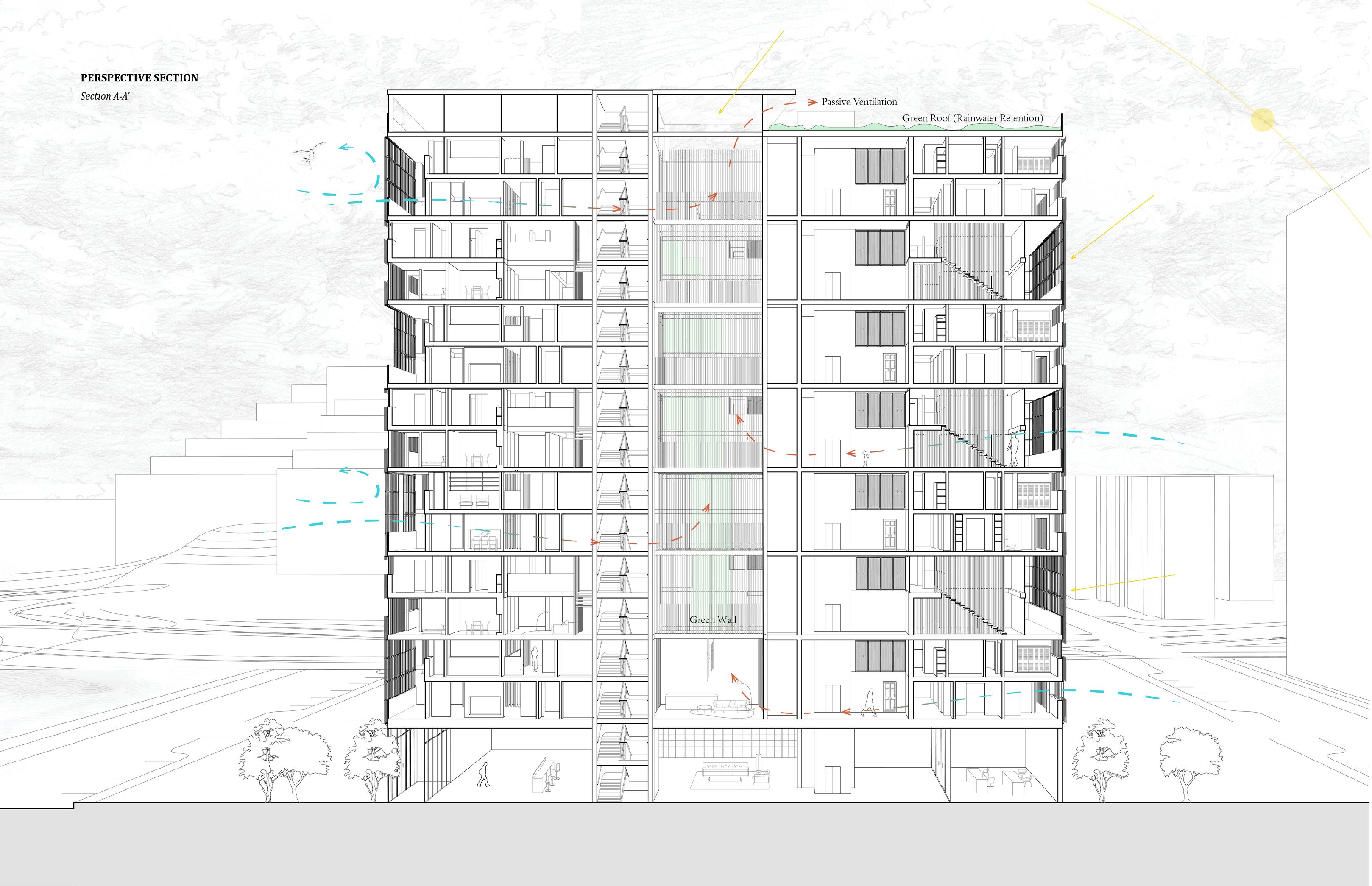 This projecct features a sustainable design that incorporates the chimney effect for natural ventilation, enhancing energy efficiency and reducing the need for mechanical systems. Additionally, its green roof and green wall systems offer rainwater retention, improve insulation, and contribute to a healthier urban environment by lowering heat island effects and promoting biodiversity.