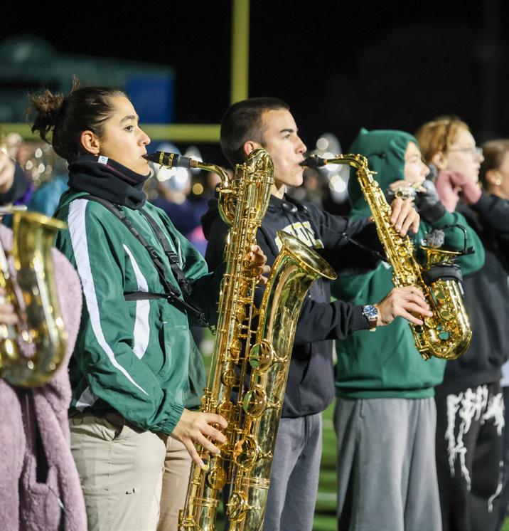 Marching on the field, Julia Sáenz (10) and Ethan Rooks (12) play the saxophone on the football field during marching band practice on Oct. 23. This was their last practice before they won state finals that weekend. Photo by Ariana Spence