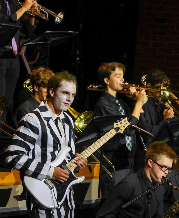 Performing a guitar solo during the Beetlejuice theme song, Theron Stockwell (12) plays in the Fall Band Concert on Oct. 13. Stockwell’s impromptu costume choice made his performance all the more memorable. Photo by Luke Kouns
