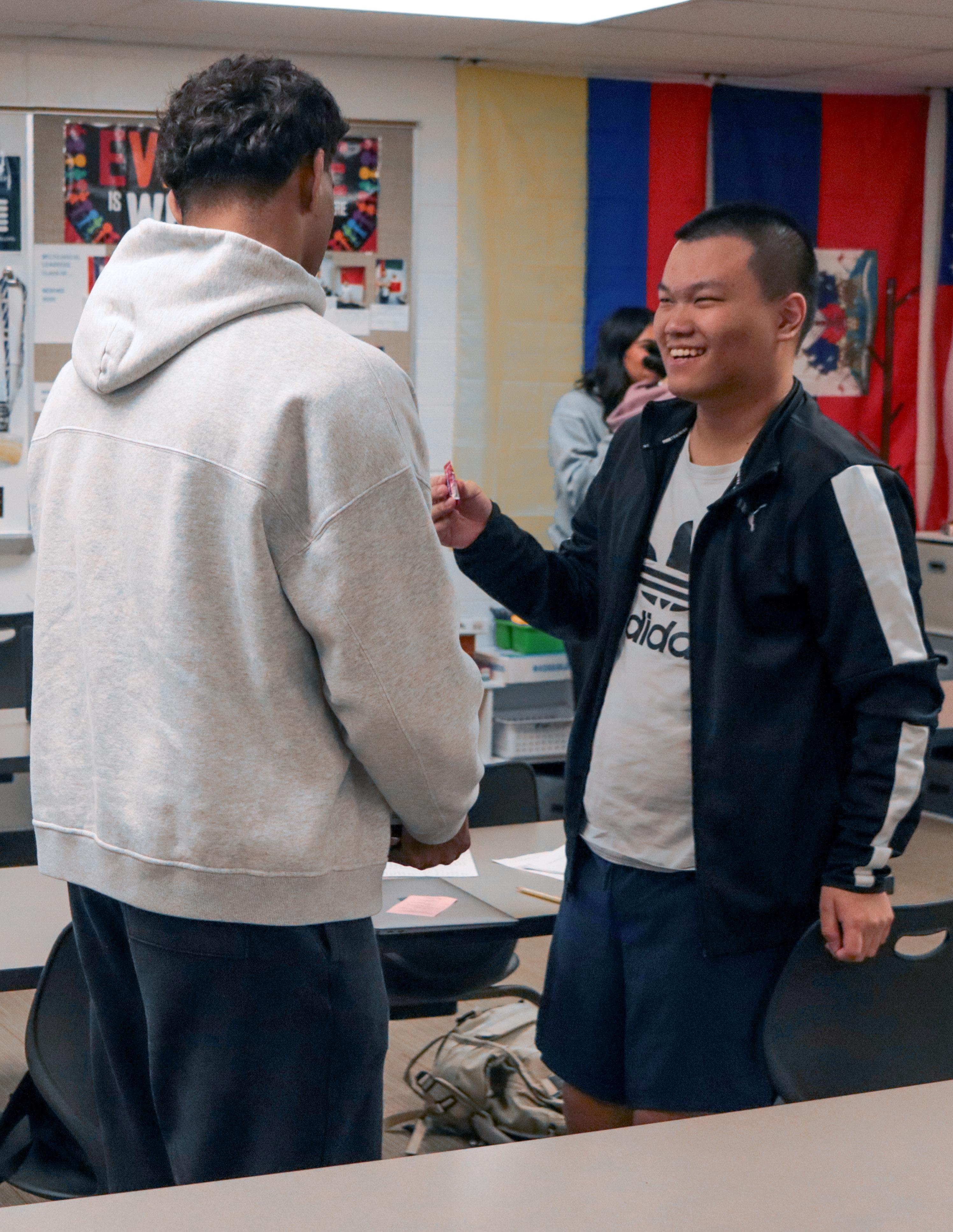 Sharing candy with Zaicheng Wang (12), Peer ML tutor Sanraj Singh (12) finishes giving a lesson about appropriate AI usage on Oct. 9. Photos by Dhani Miller