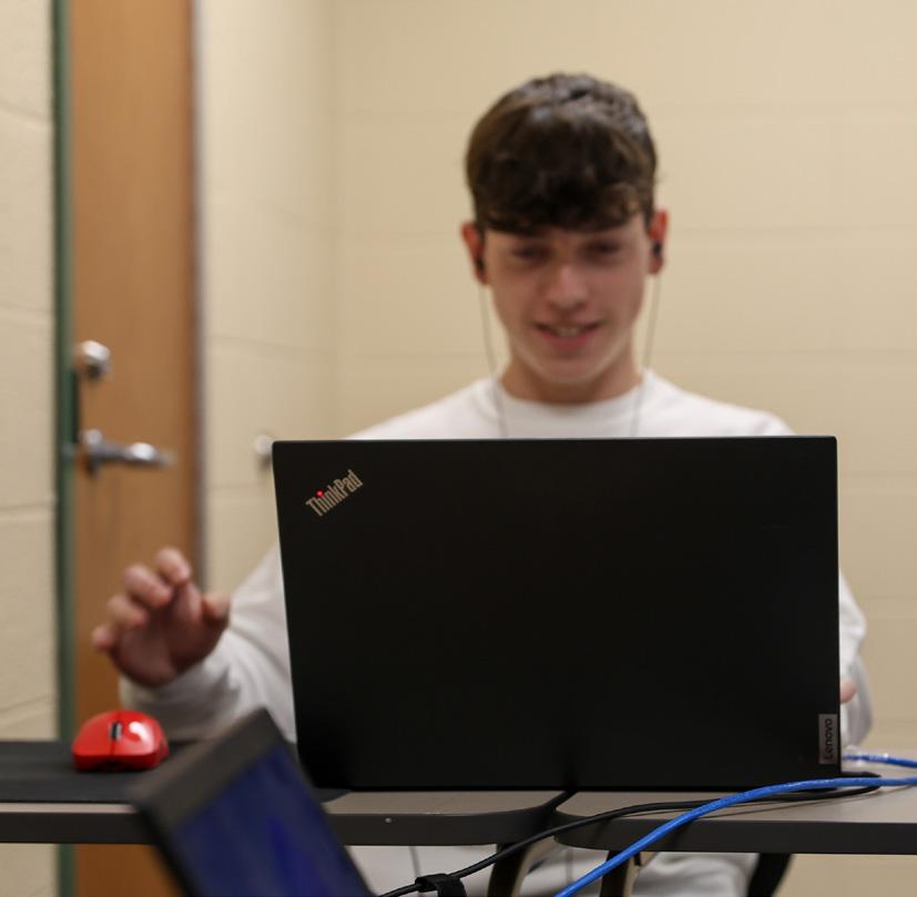 Preparing for the first game of the year, Connor Byrum (12) plays Valorant on Sept. 29. As the team's captain he made sure the team was ready by practicing with them. Photos by Colin Adam
