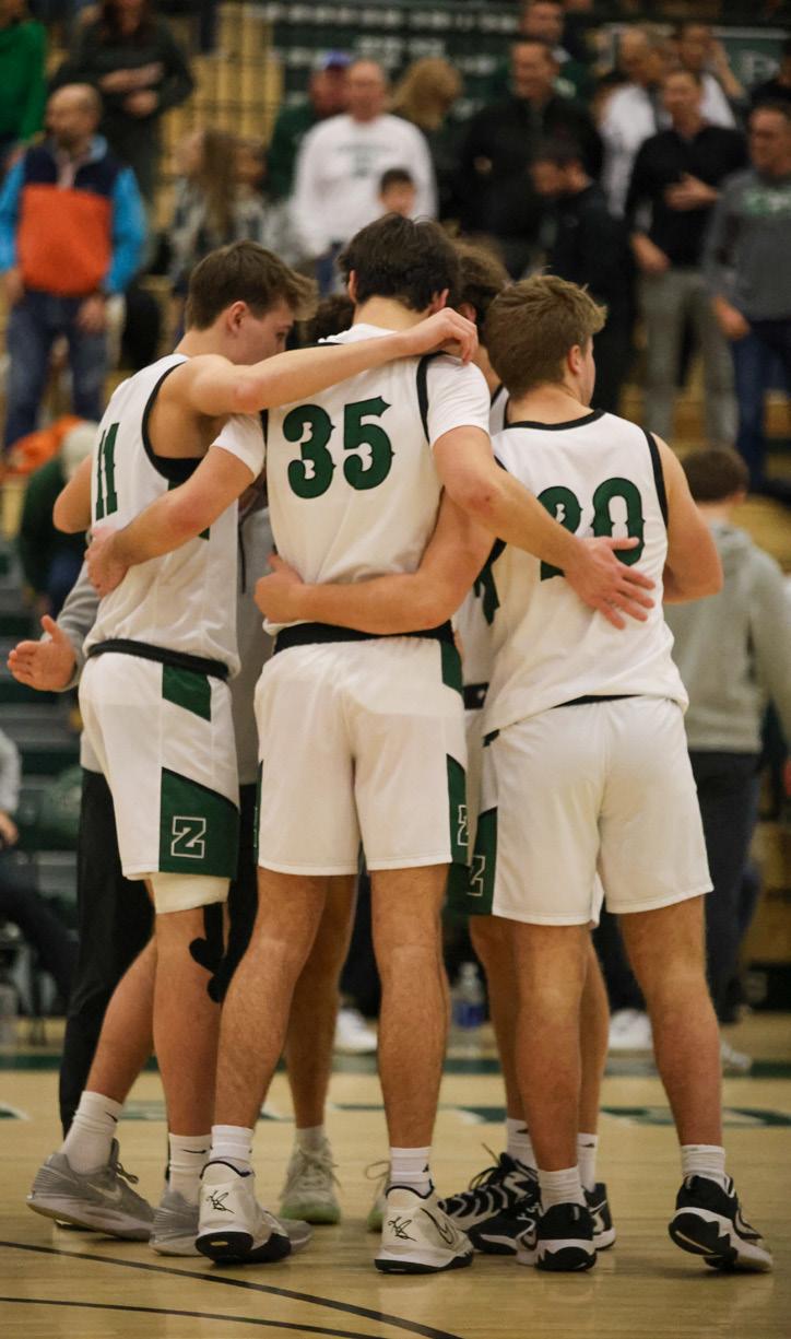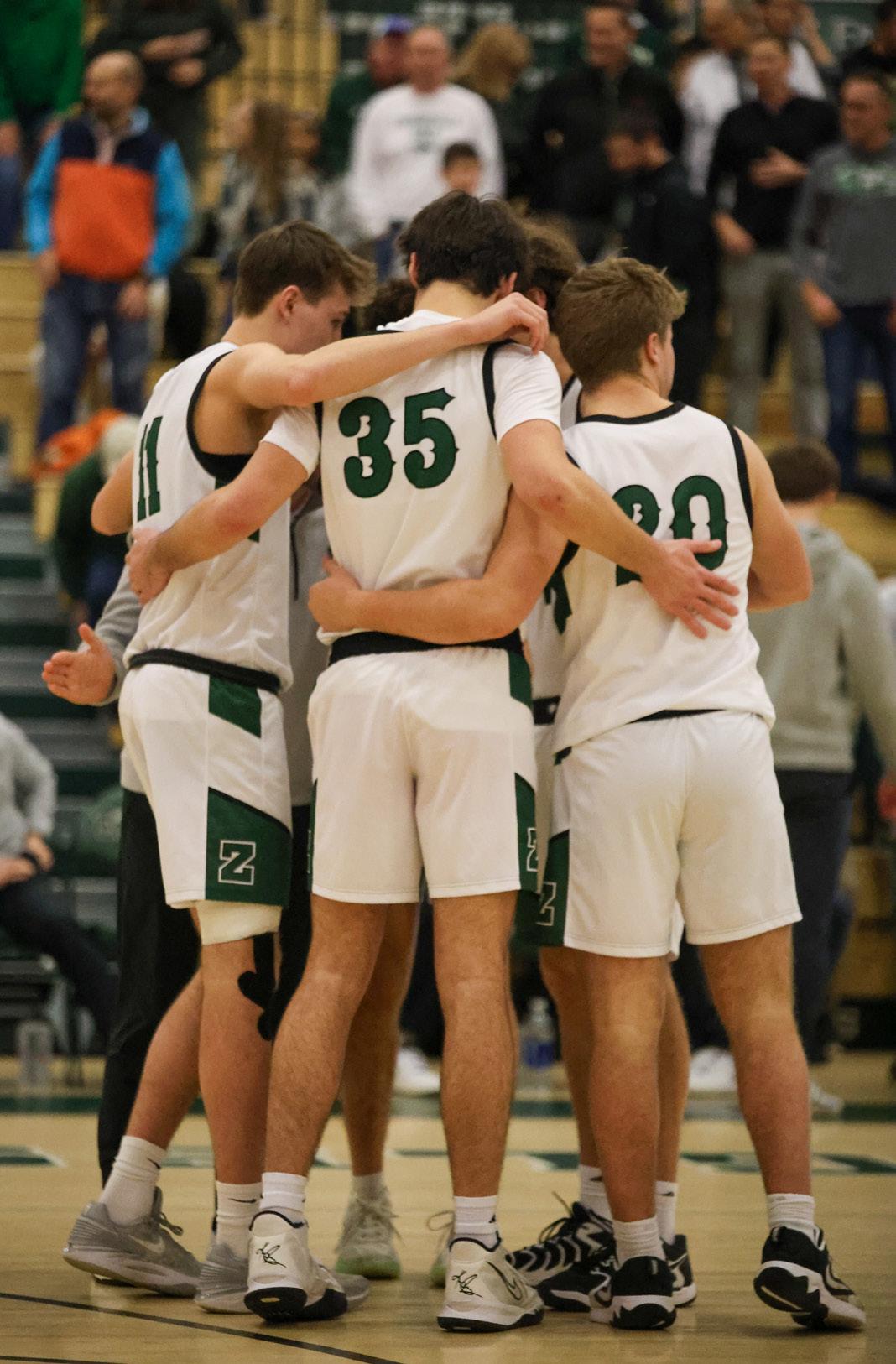 Drew Snively, senior, huddles up with his team during game against Avon High School on Feb. 6. Photo by Josie Brackett