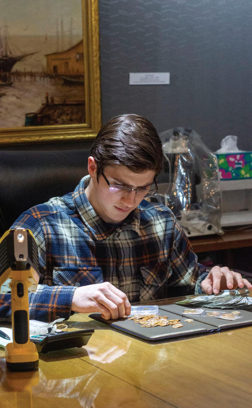 Michael Stanfield counts gold at Midwest Estate Buyers, where he works during his Work Based Learning time on Feb. 2. Photo by Lilly Steele.