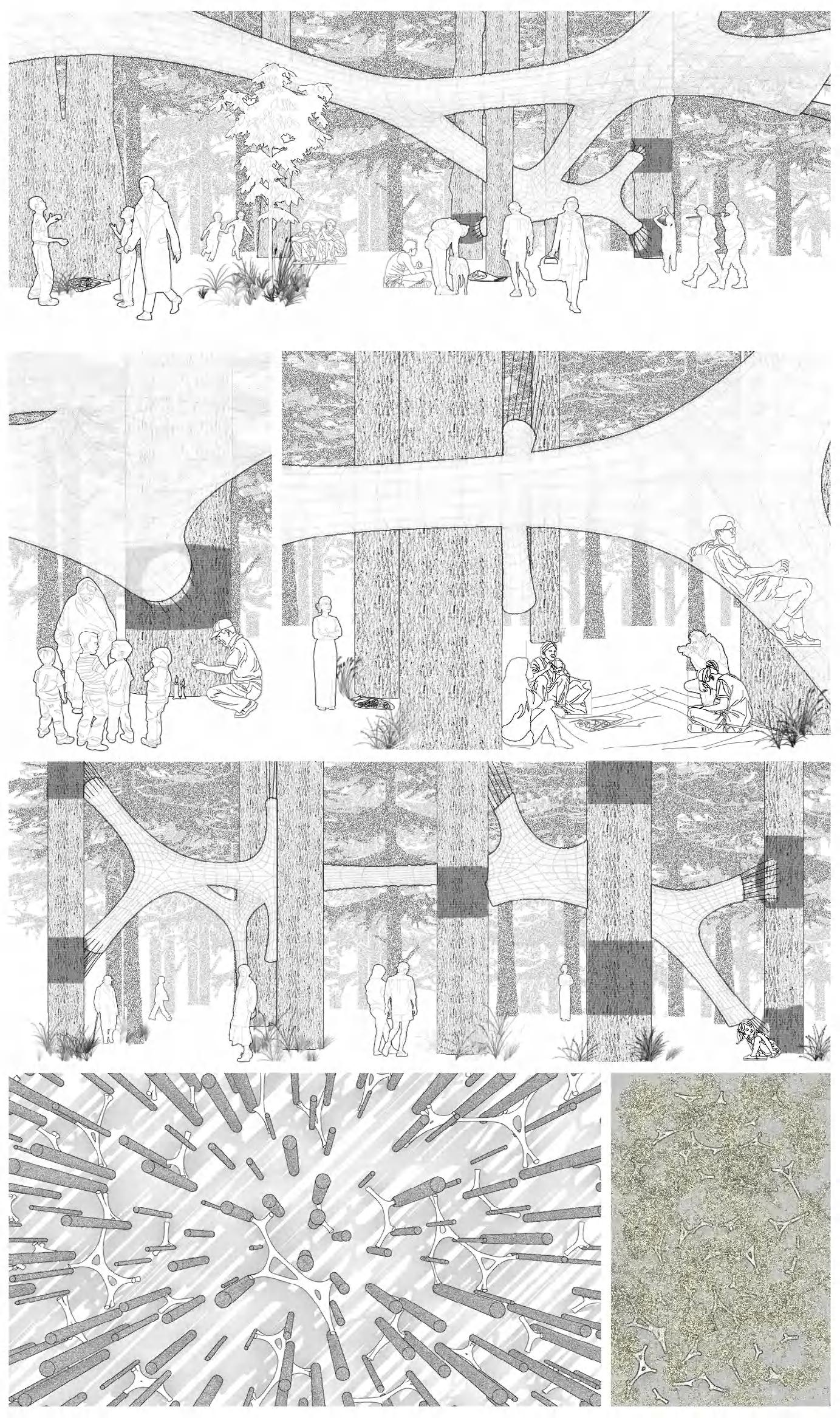 Unlike normal graves, the installation creates a place large enough for more activities to happen while people come to visit. They could spent their day camping in the woods, chating while kids playing together. It creates the feeling that they are also spending these happy moments with those who already passed away. Mourning no longer will be filled with sadness, but a sense of reunion.
