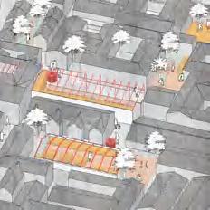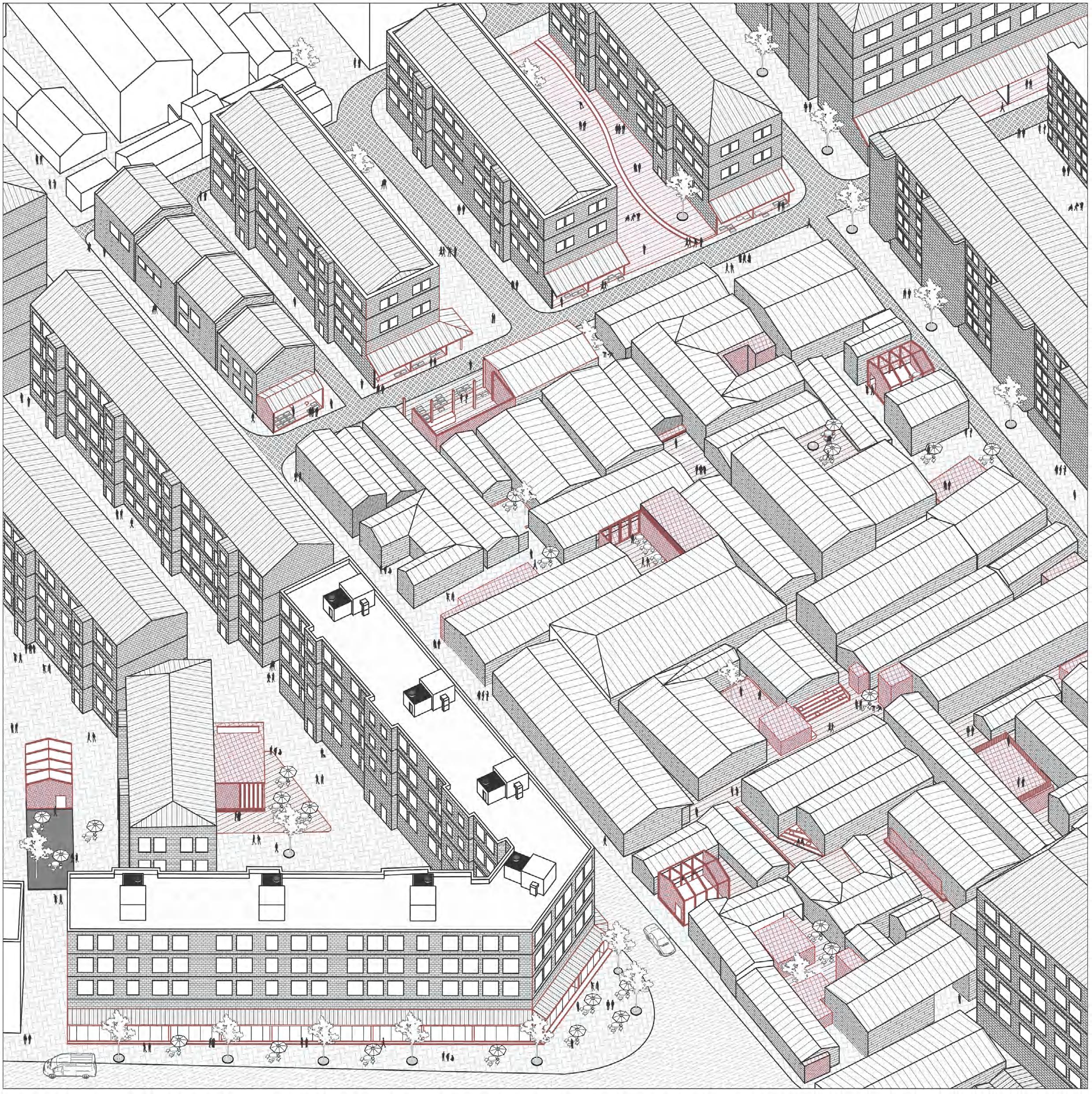 The team tried to recativate the neighborhood by not only reprogram the buildings in two main areas but also create new well-like nodes between pocket spaces hidden deep inbetween the lanes.