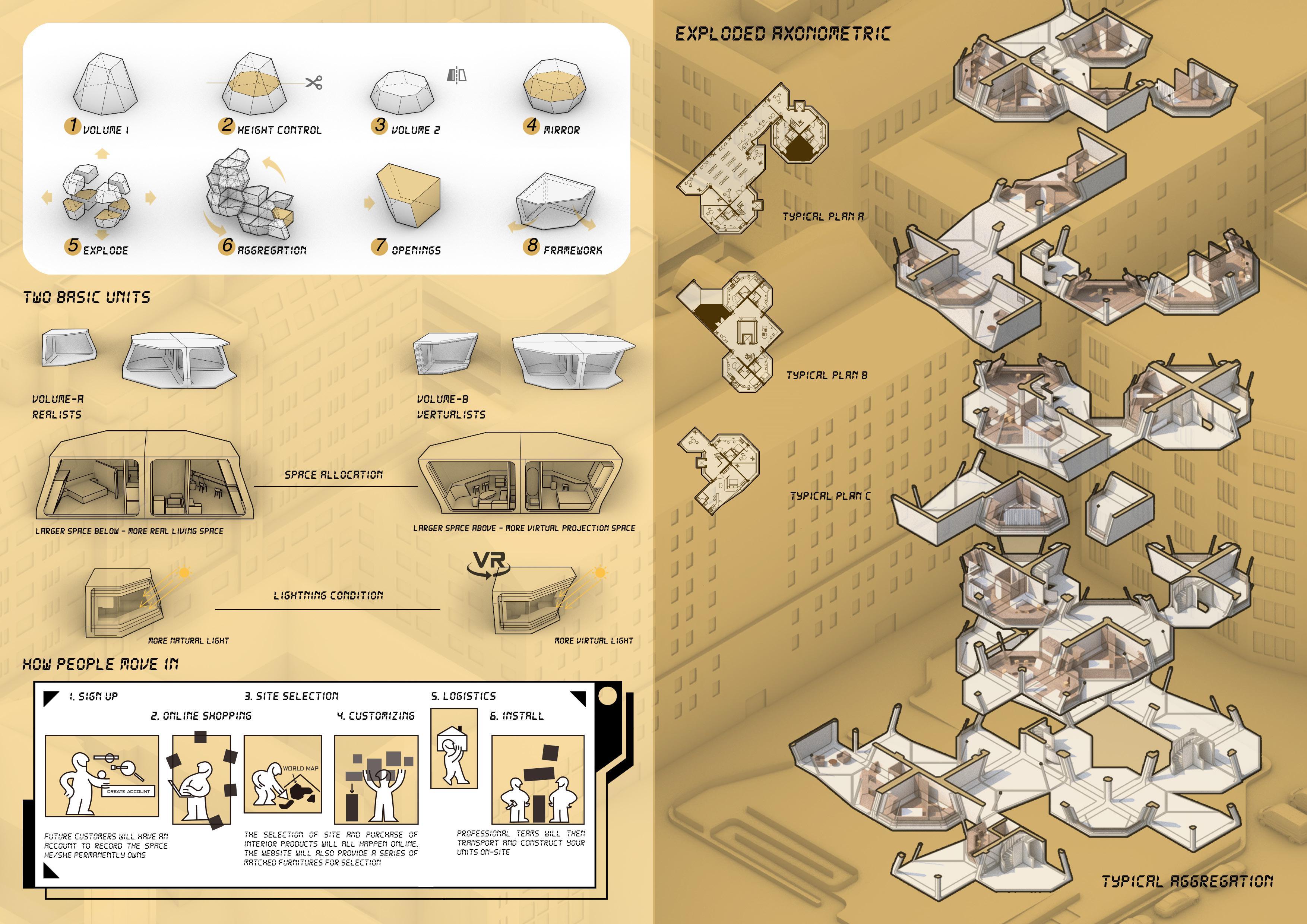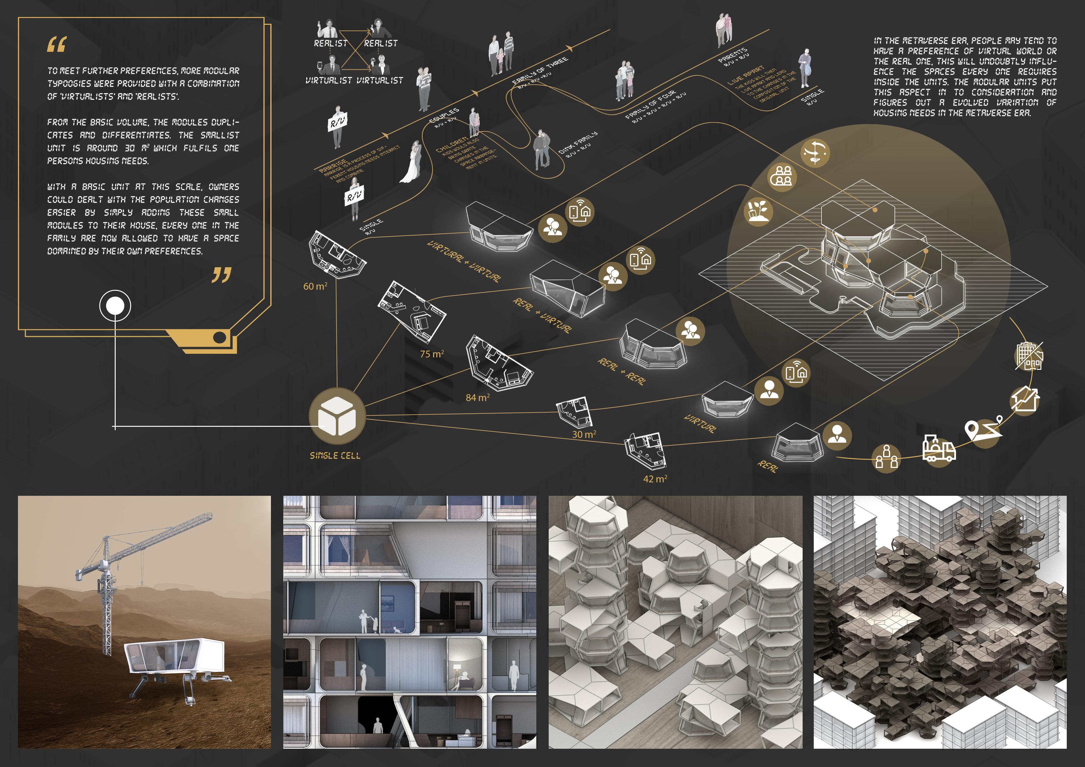 In the metaverse era, people may tend to have a preference of virtual space or the real one, this will undoubtly influence the spaces everyone requires inside the units. the modular units put this aspect in to consideration and figures out a evolved variation of housing needs in the metaverse era.