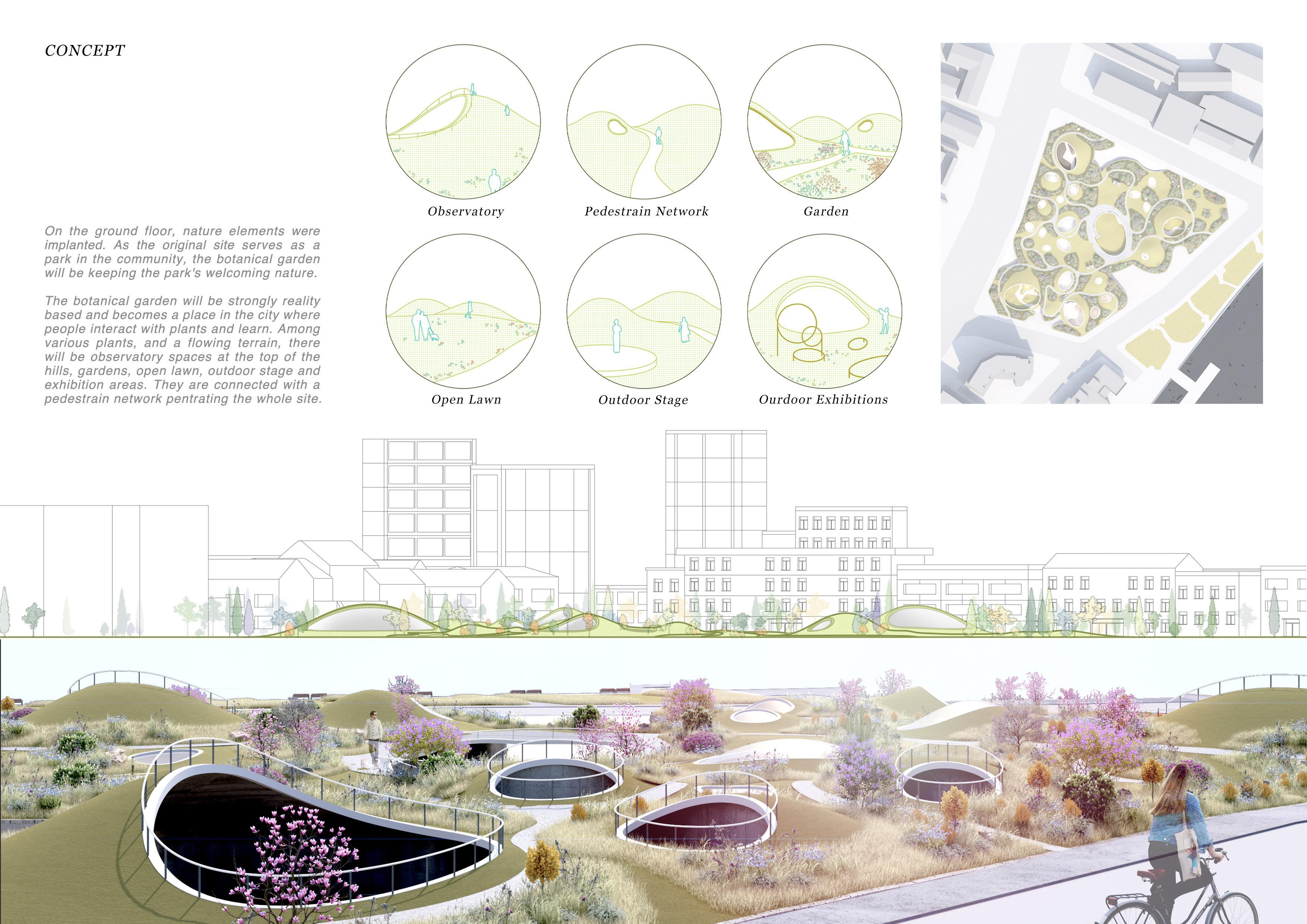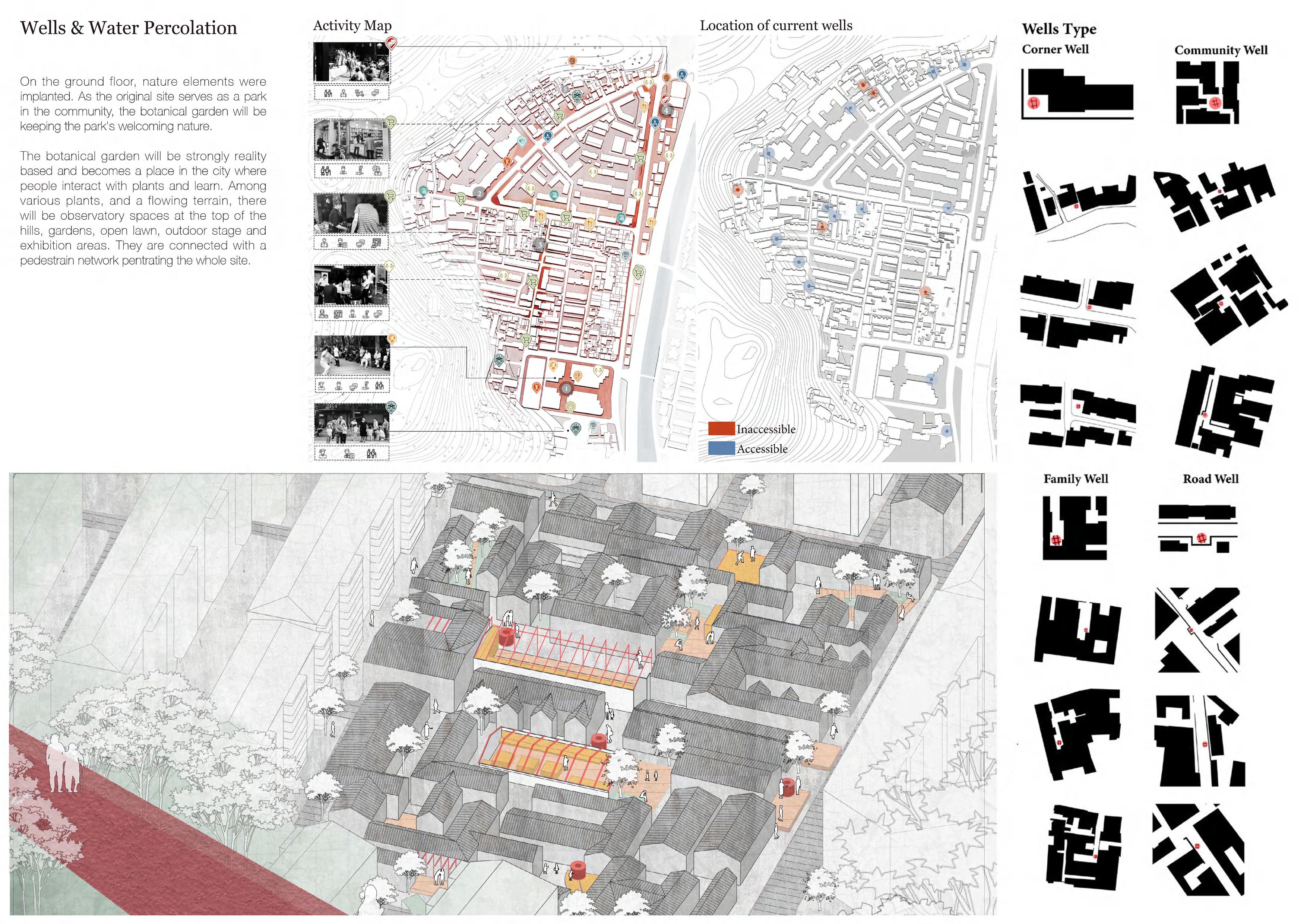 However, the district is now quite old with facilities that doesn't serve well. Can we reactivate the lanes and pocket spaces between the buildings and make the neighborhood alive again? The team tried to achieve the goal by not only reprogram the buildings in two main areas but also create new well-like nodes between the buildings. These new mini programs will again bring energy to the lanes and percolate into the whole community.