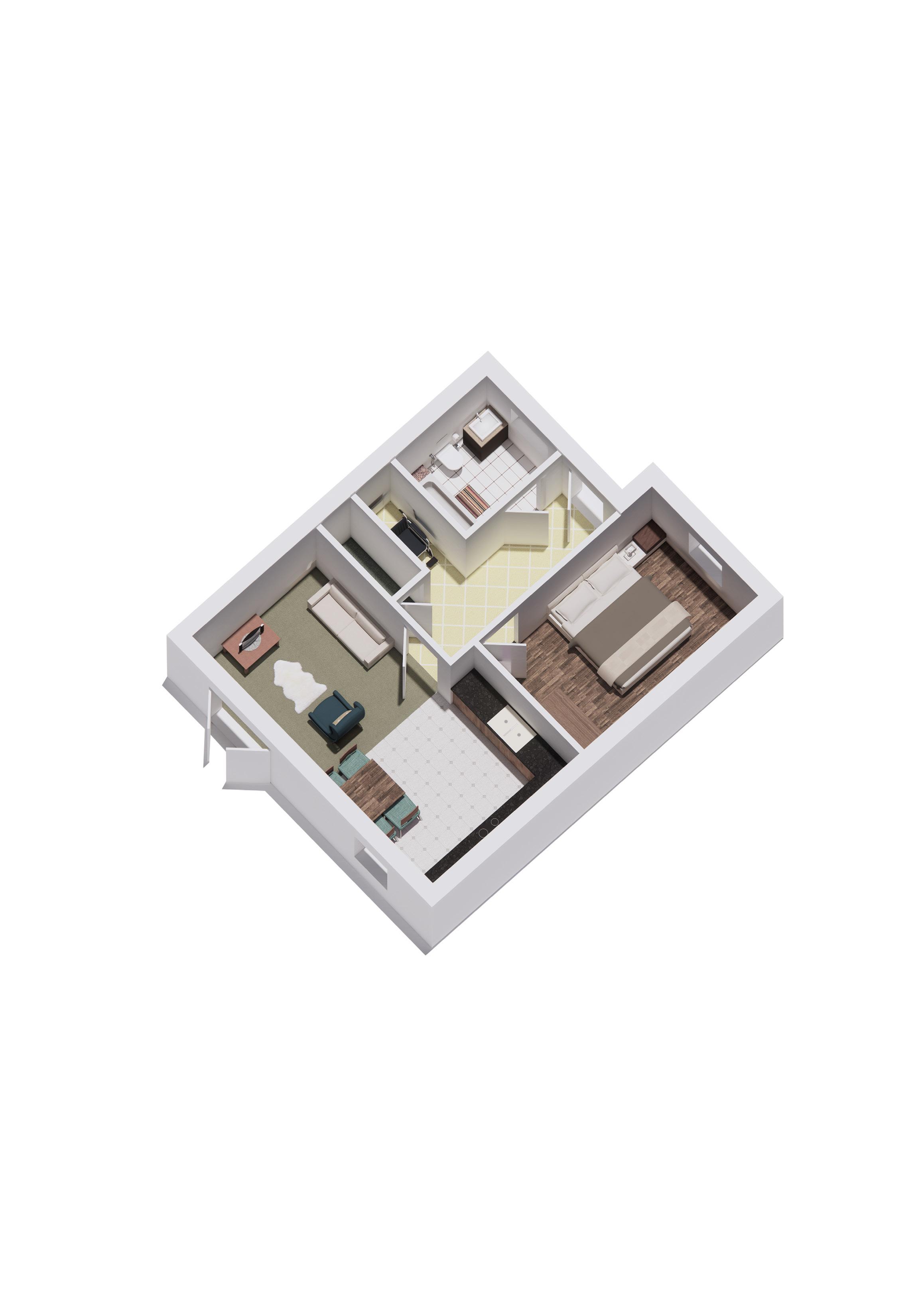 Homes will be self-contained units with their own front door, delivered as apartments or bungalows where space allows. Each unit will include a double bedroom, open-plan kitchen/living area, bathroom, and storage, and will be designed to M4(3) standards. A mix of fully accessible (e.g., lowered kitchen units) and adaptable layouts will be provided, as well as a 2 bedroom apartment suitable for a couple.