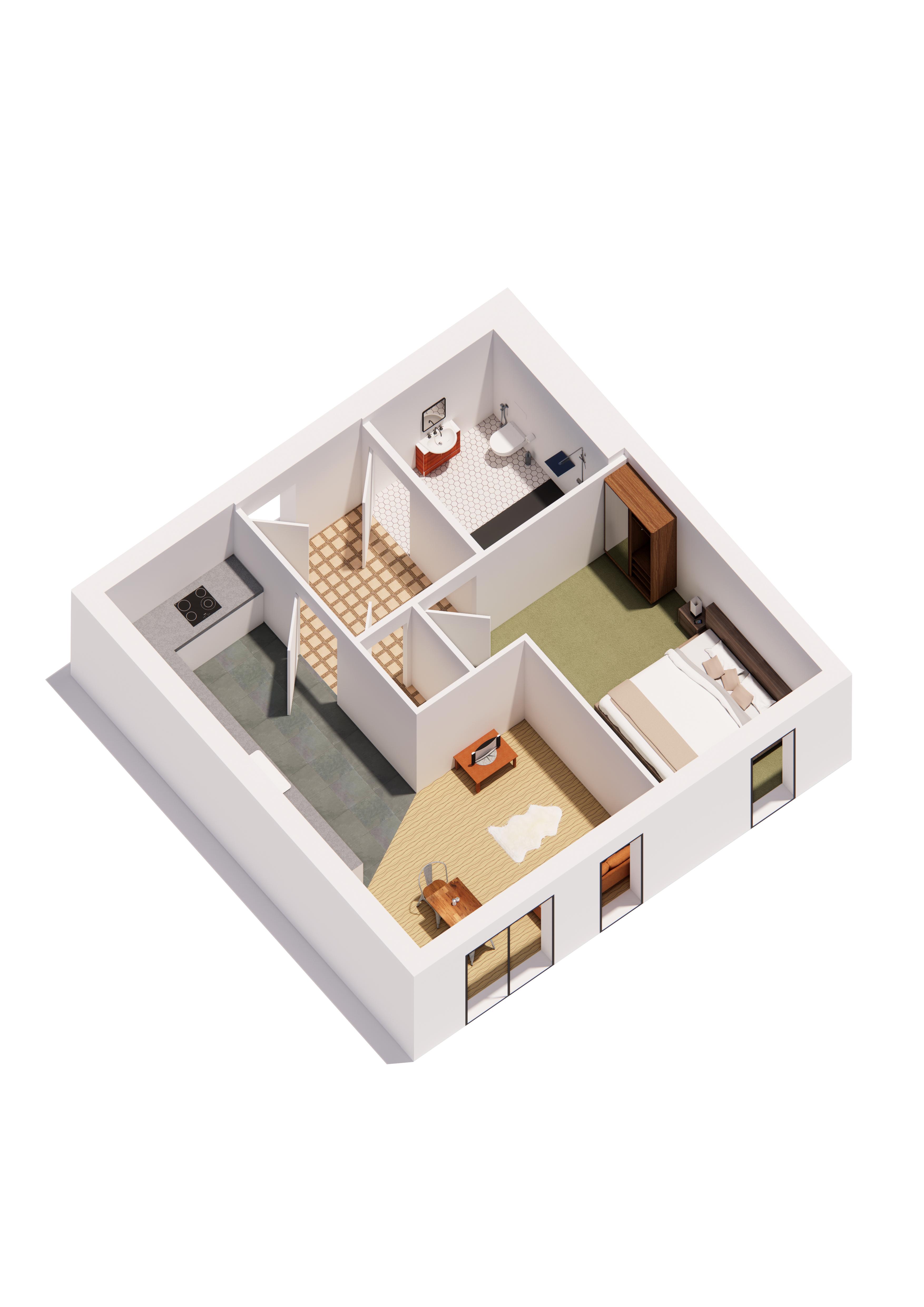 Flats are to be self-contained studios with their own front door accessed from a communal corridor. Each flat will have an en-suite double bedroom, with a shared kitchen and living area between every two units. A single, monitored point of entry is essential, observed from a staff area. Resident numbers will depend on the complexity of mental illness—ranging from 4–6 in higher-need settings up to 28 where appropriate. Smaller clusters help reduce behavioural influence between residents.