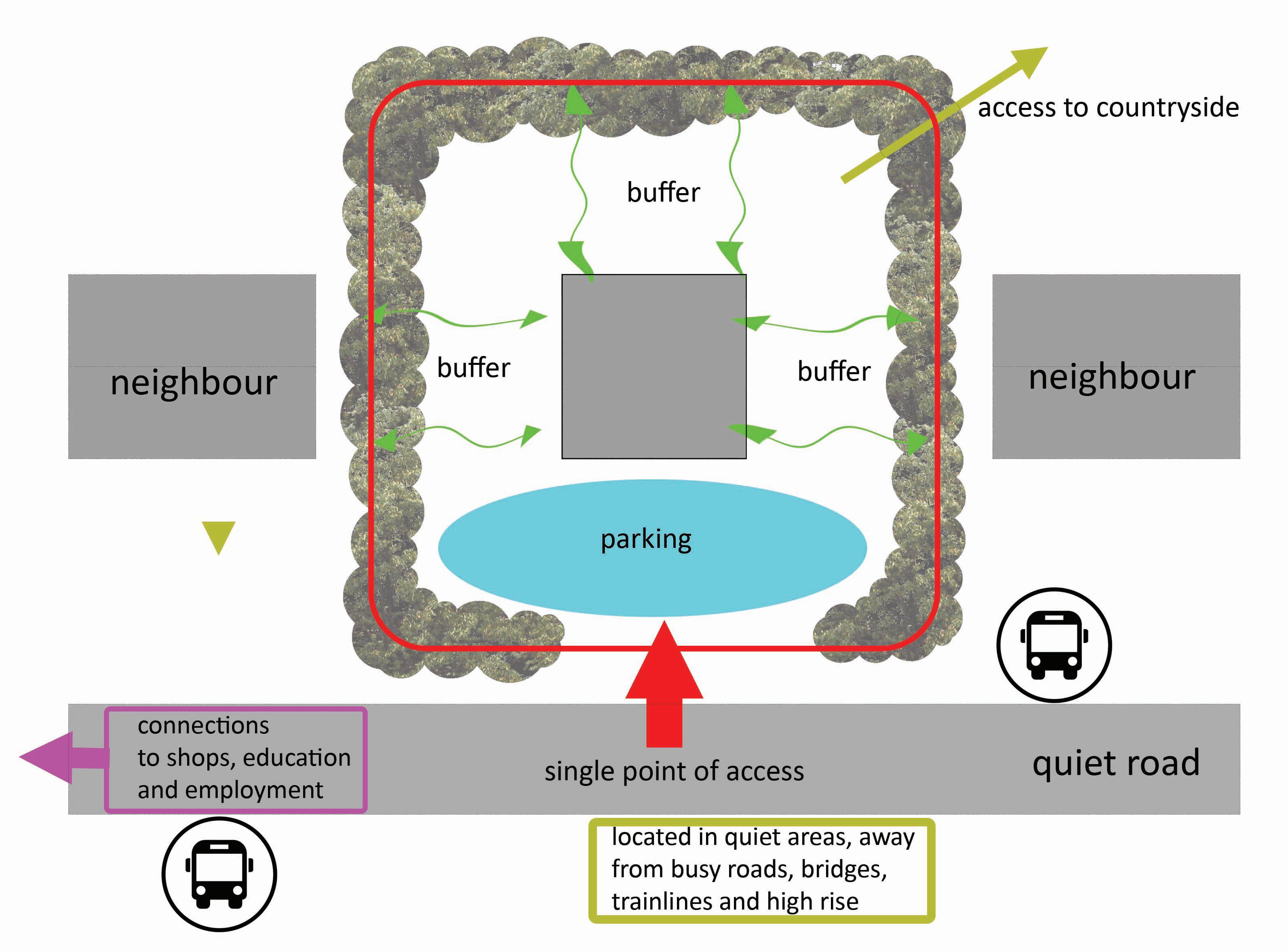 Sites should be near regular bus routes in well-connected smaller towns (e.g. Princes Risborough), but away from busy roads, bridges, or train lines due to suicide risk. Locations must also be safe with low vulnerability to drug activity.