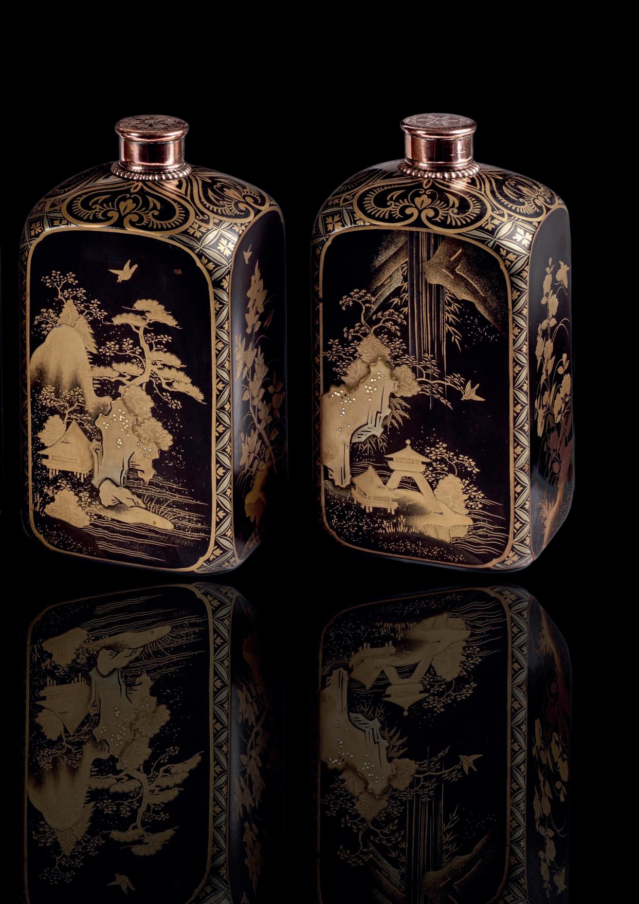 The bottles with red copper (possibly once silvered) lids that screw onto short metal necks, have very high-quality decorations in hiramaki-e, takamaki-e and taka-zogan of rocky landscapes with trees and birds, alternating with various plants, at the angles of the body a cash pattern decoration and the shoulders decorated with four formal patterns.