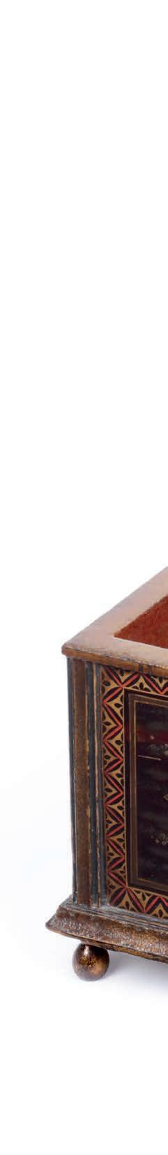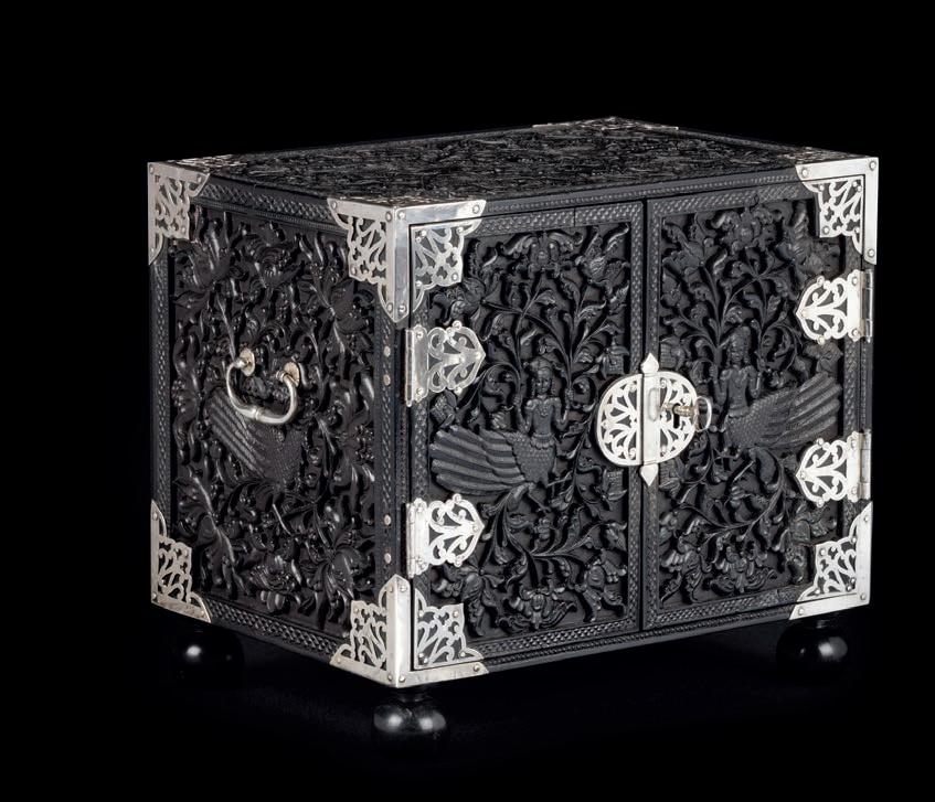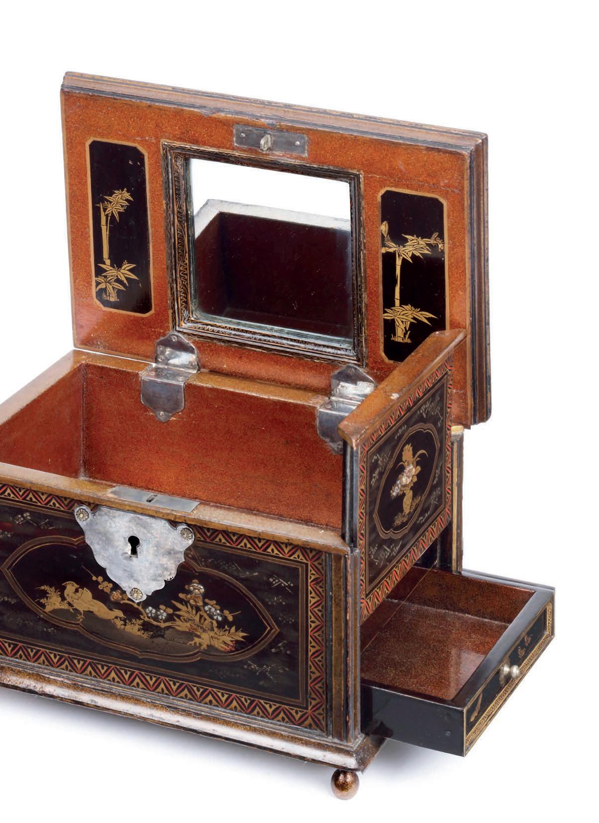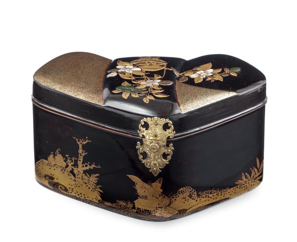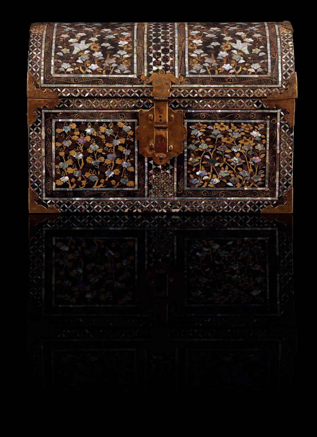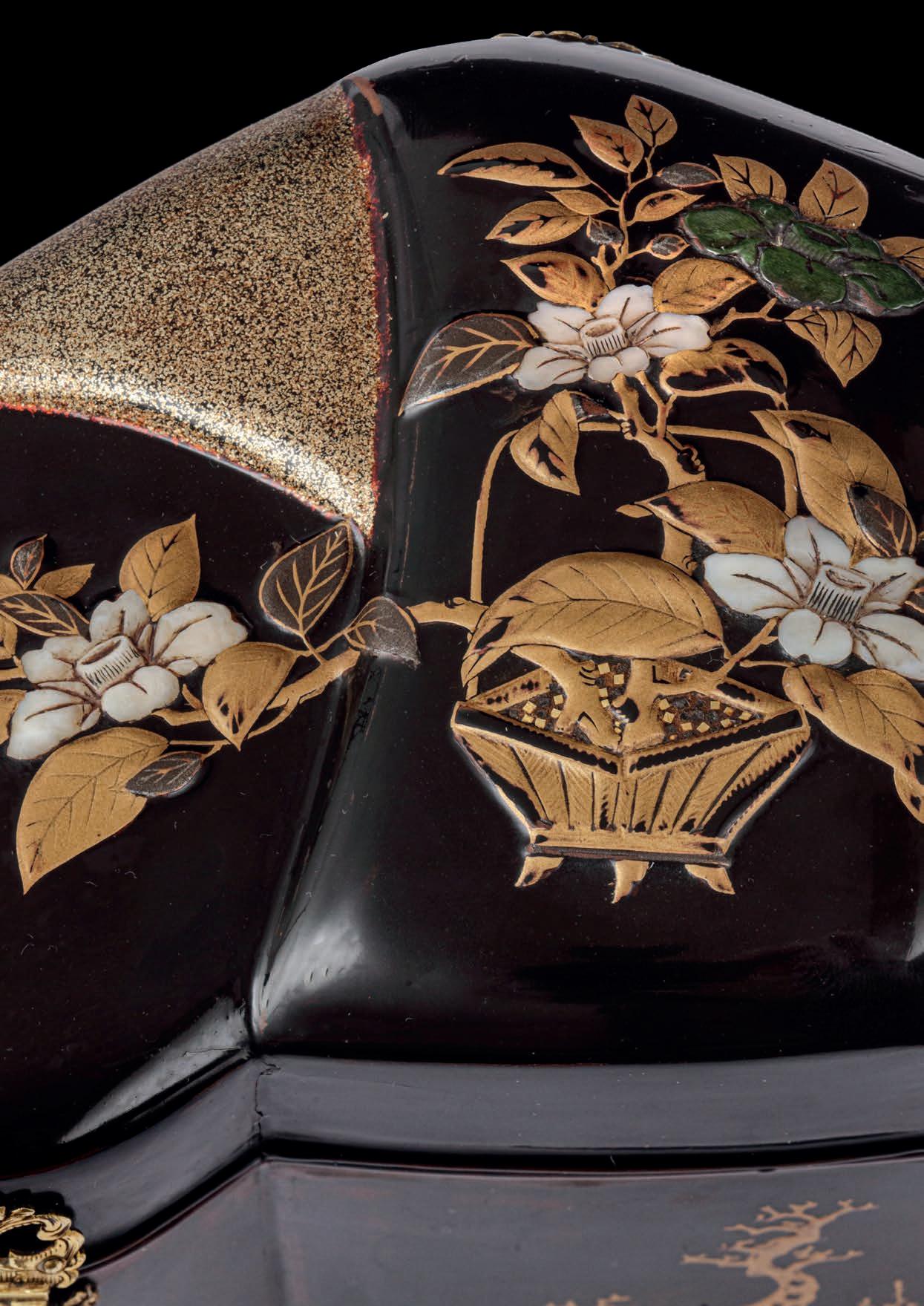 40.This richly decorated jewellery casket with a concave lid belongs to a period in Japanese export lacquer coined the transitional phase. After the Dutch East Indian Company took over the Portuguese monopoly on lacquerware, Japanese lacquer craftsmen slowly shifted their style from the well- documented Namban style towards the so-called Koumou-style in order to satisfy the demand of their new ‘redhaired’ clientele.