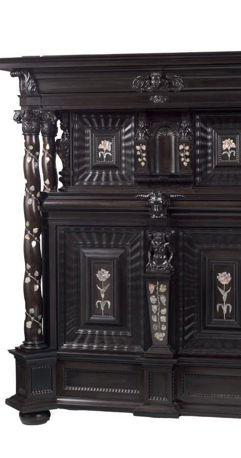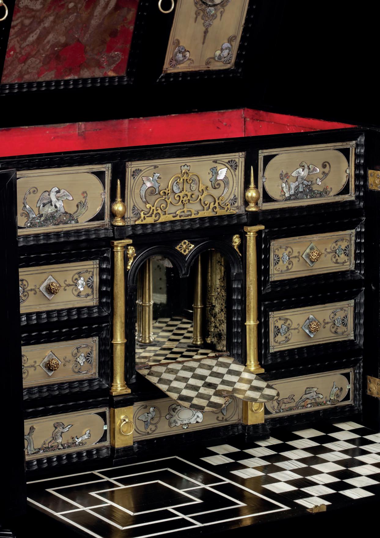 The overall ebony veneered cabinet on four bun feet, supporting ebony Termini in the form of a massive ebony three-horned faun with ionic capital, the front two diagonally placed, the back pair facing outwards. The two doors with yellow or gilt copper mounts reveal a magnificent interior of a long folly panel resembling three top drawers, a central painting on copper flanked by four small drawers, under which a long bottom drawer, all above a retractable games board. Each drawer, with a gold or gilt filigree puller, and both the interiors of the doors are decorated with a slat of uncoloured baleen overall inlaid with pen-engraved mother-of-pearl and silver-thread in ‘kwab’ or auricular design (for comparable design see: the fence of the choir in the Nieuwe Kerk in Amsterdam after a design by Johannes Lutma, 1645).