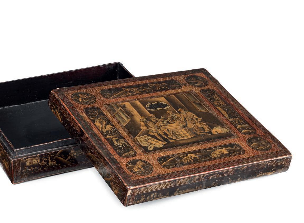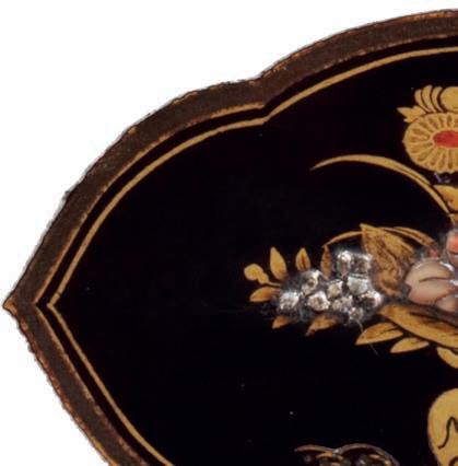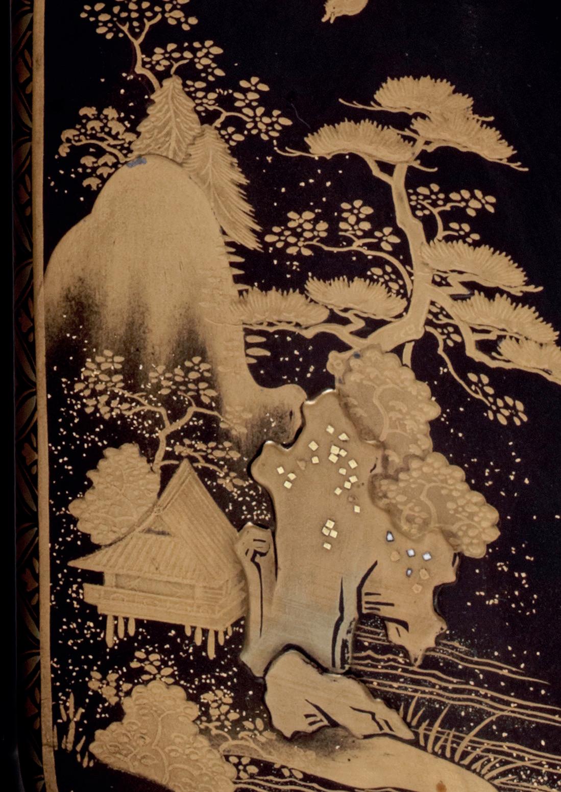 stylistic characteristics of the trees, houses, and foliage though, it becomes evident that the piece belongs to a group of items that can be found in the collections of Versailles (Kopplin, p. 92), and Burghley House (JWA09002, 09045, 09064). It therefore undoubtedly originated from the same Kyoto-based workshop that produced order-made lacquer boxes of the highest quality for the European royals. As early as 1642, we find orders within the archives of the Dutch East India Company asking for small, but ‘extraordinary rare and costly’ lacquerware boxes that could be transported to Europe inside larger chests and cabinets (Canepa, p. 377). Many of these ended up in France, the country with some of the most avid lacquer collectors of the era. The fact that this particular work has been fitted with 18th century ormolu mounts that are virtually identical to those seen in lacquer from the Adolphe Thiers collection of the Musée du Louvre (TH405), strengthens the suspicion that it belonged to a French collector, and possibly even Marie Antoinette herself.