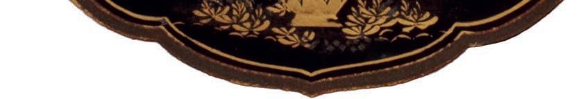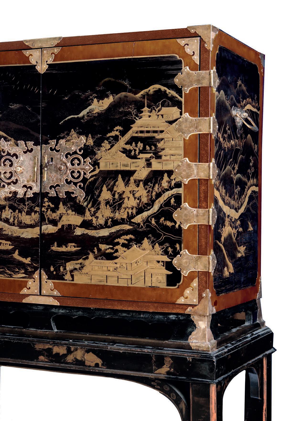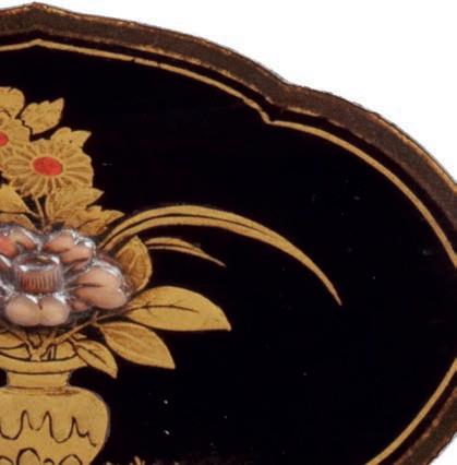 cart that is taken straight from the Tale of Genji, as well as the chrysanthemums growing through the ‘Eastern Fence’ in the famous poem by Tao Qian. Such profoundly Asian cultural references would have hardly rang a bell amongst the European clientele. Yet, the undeniable quality of the piece suggests that it was destined for a European nobleman or -lady; a suspicion further reinforced by the application of metal fittings of the type favored by early French collectors of Japanese lacquer.