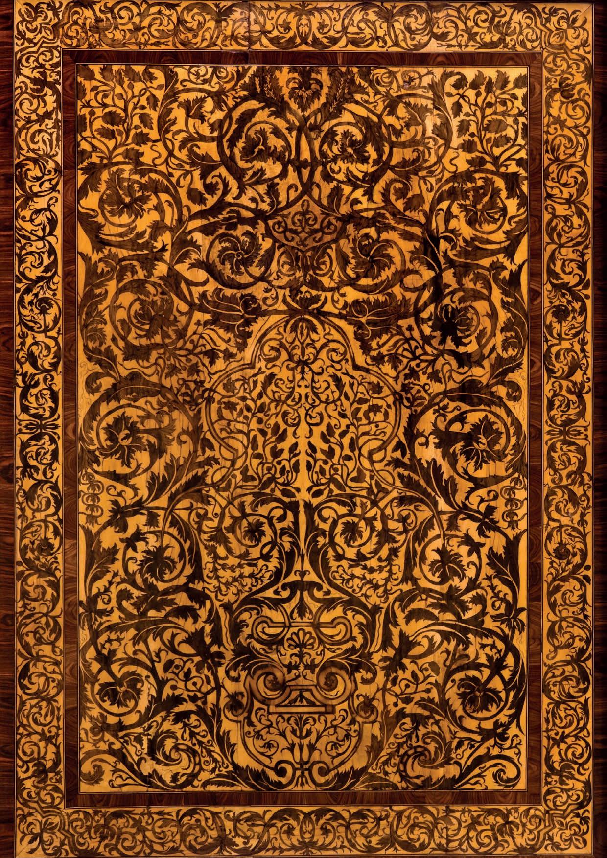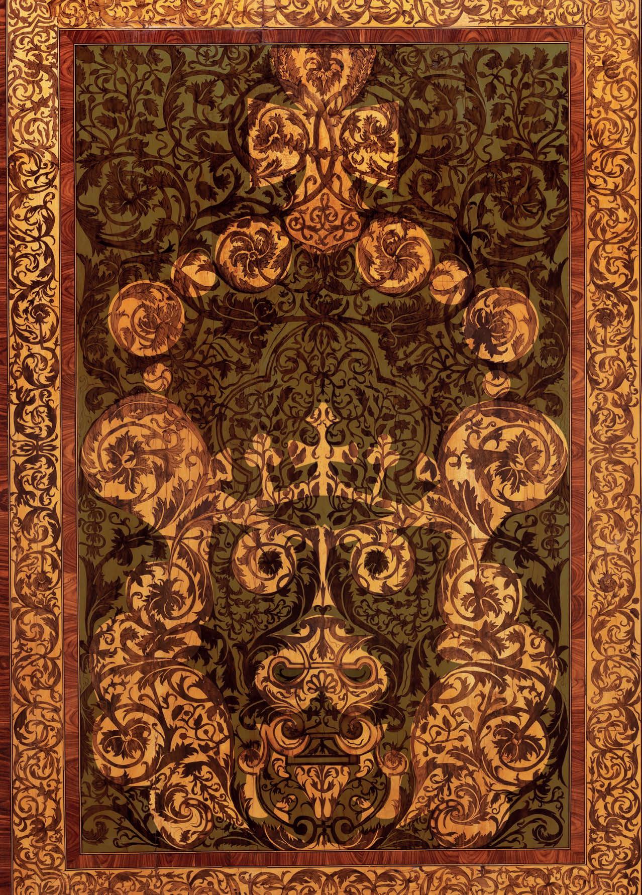 Today we can’t comprehend that 17thcentury people would immediately understand the symbolism. However, sources prove that myths and symbolism were part of education and shared knowledge, at least amongst the literate and educated upper class. With the intricate decoration, a cabinet like this would be a good enough conversation piece for William’s and Mary’s status. After all, a generic one with just a geometric motif was for ordinary people. On the other hand, a cabinet with custom-made iconography would be most entertaining to guests in a candle-lit drawing room. You can imagine a company chatting about the different flowers and their meanings. Another argument for the symbolism being not hidden is a bureau in the Royal Collection Trust, which Gerrit Jensen delivered (in whose studio Van Mekeren worked) in 1690 to William and Mary. The decoration holds the same flora and symbolism as this cabinet, the only difference being a clear monogram with a crown above. The symbolic plants and flowers are just as present on the cabinet, but with a monogram, showing that they were not hidden on both pieces. There is also a gueridon known, not documented, but by repute in the United Kingdom, with the same decoration.