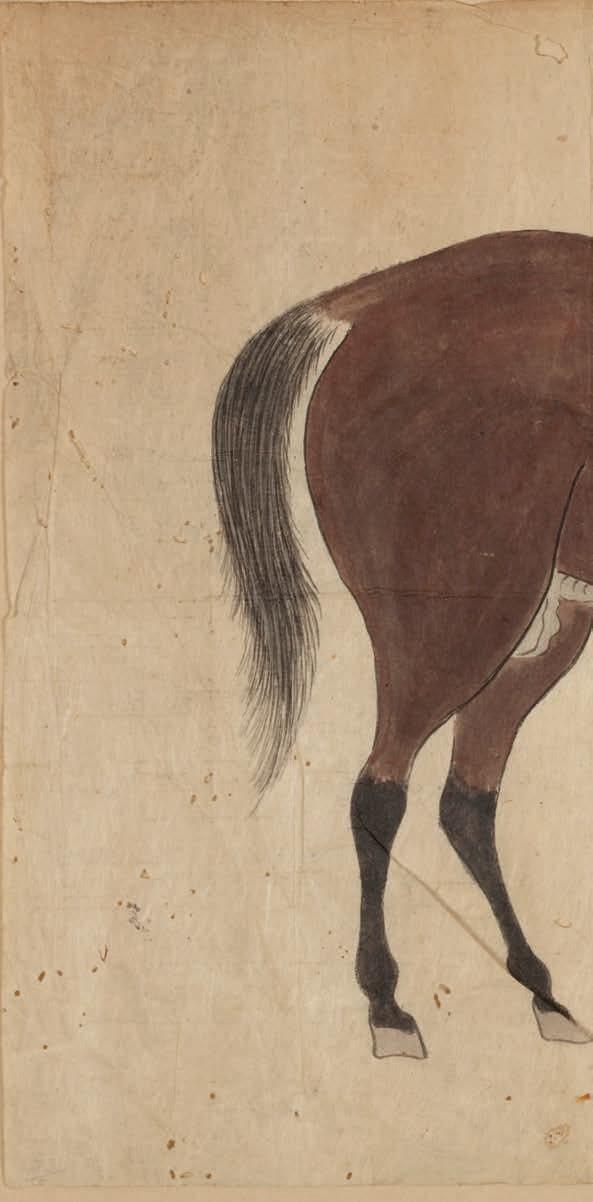 With inscriptions in Japanese reading: ‘The horse is a chestnut male horse from e. Age is approximately 6 years old. The length of the face is approximately 27 cm (?). Hair is approximately 14 cm long. Mane is approximately 15 cm long of curly hair.’