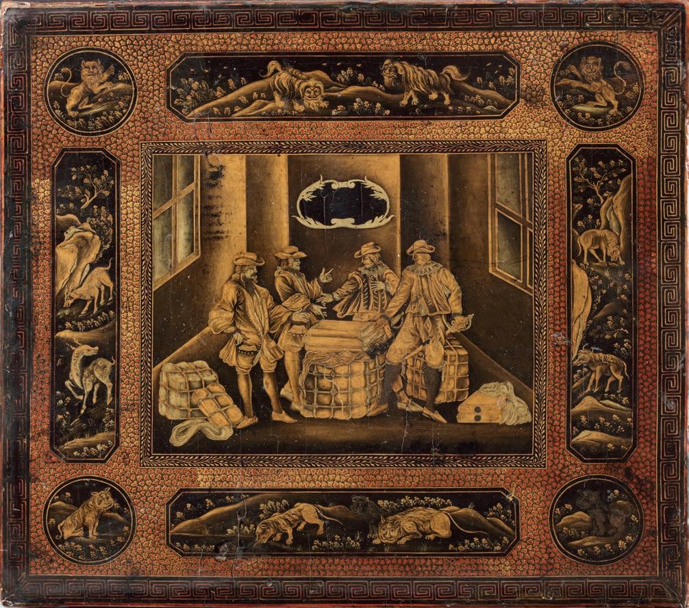 This meant abandoning the use of geometric borders with generous use of mother of pearl inlay in favour of a more sober, picturesque style of paintings on a solemn black background. As seen in this remarkable casket, the decorations still show remnants of the decorative borders and cartouches favoured by the Portuguese, whilst simultaneously showing a strong development towards the new fashion that came to dominate Japanese export lacquer after the 1650s.