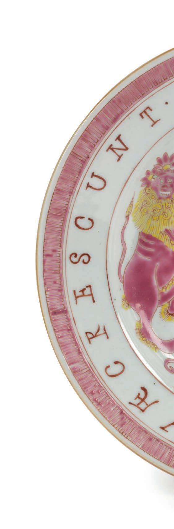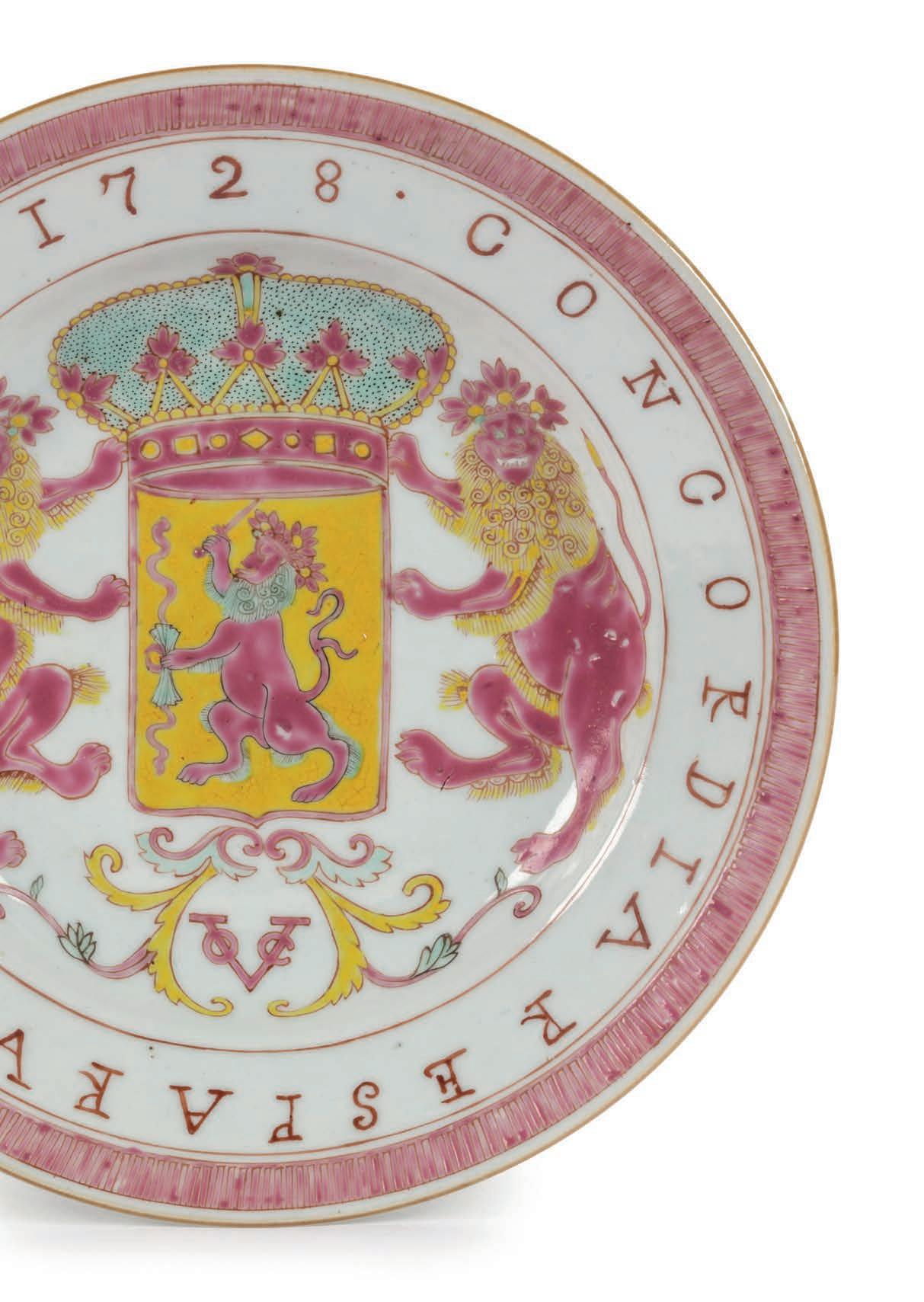 Executed in rose-pink, yellow, and soft blue-green enamels, this design follows in almost every aspect a silver ducatoon of 1728, with even the rim of the plate imitating the ribbed milling of the coin. On a shield is a crowned rampant lion, holding in his left paw a bunch of seven arrows symbolising the seven provinces of the United Netherlands, and in his right paw a sword is shown supported by two crowned rampant lions. Below the shield is the monogram of the VOC, the Dutch East India Company, above the date 1728 and around it the heraldic motto of the Dutch Republic CONCORDIA RES PARVAE CRESCUNT (by unity small things grow).