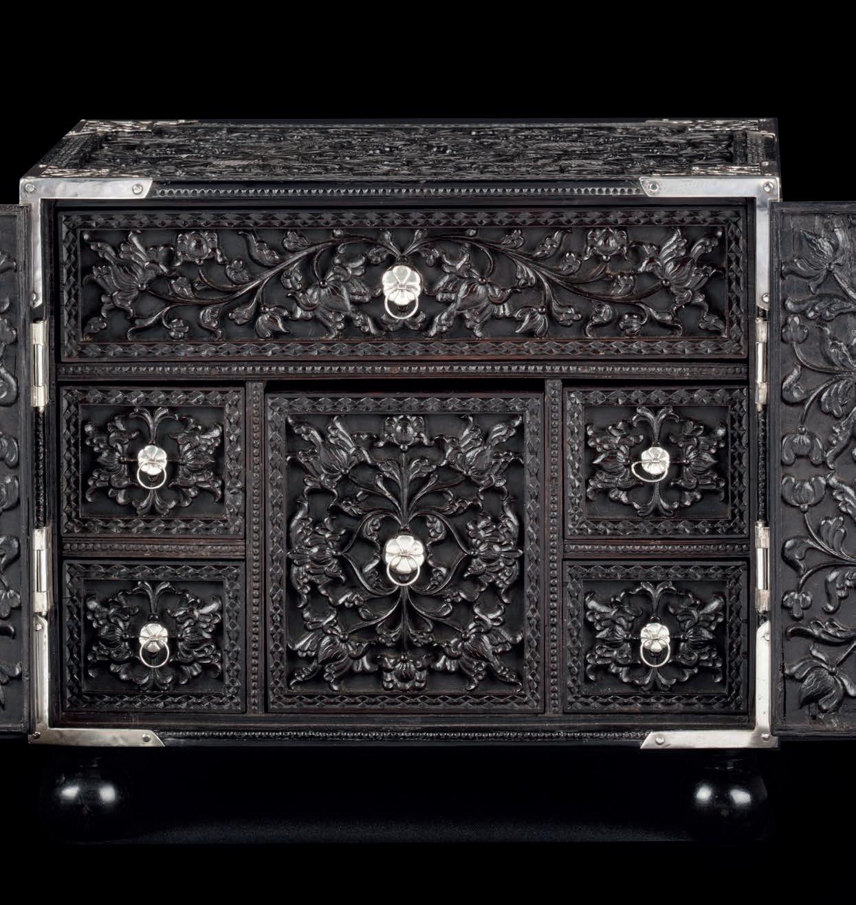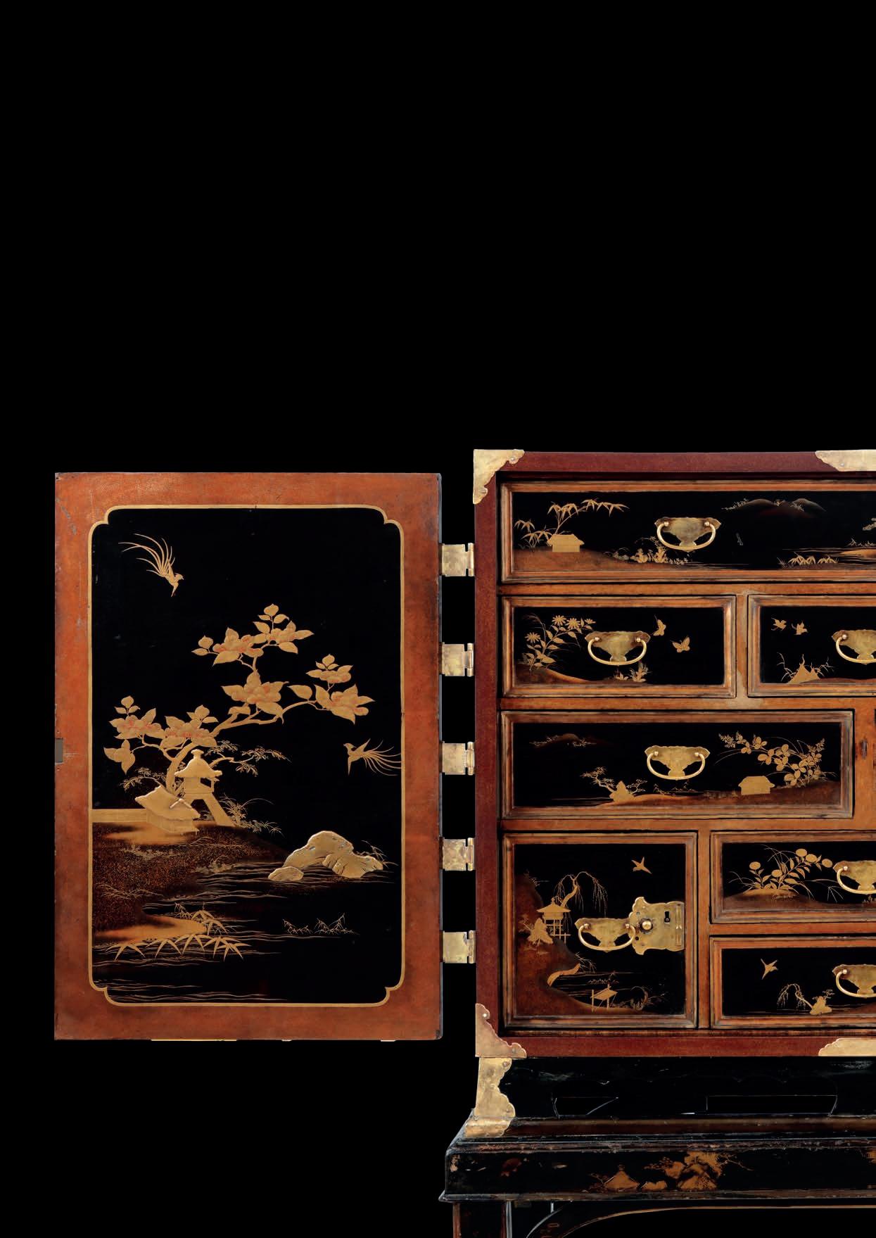 Deshima in the port of Nagasaki. The present cabinet and the one in the Musée des BeauxArts in Dijon must have been ordered by or for a highranking VOC official at about the same time the two cabinets in the Royal Collection were commissioned, most likely by the Amsterdam VOC Chamber. The present cabinet is slightly smaller than both the Royal pair of cabinets and the Musée des Beaux-Arts one, but arguably is finer in detail.