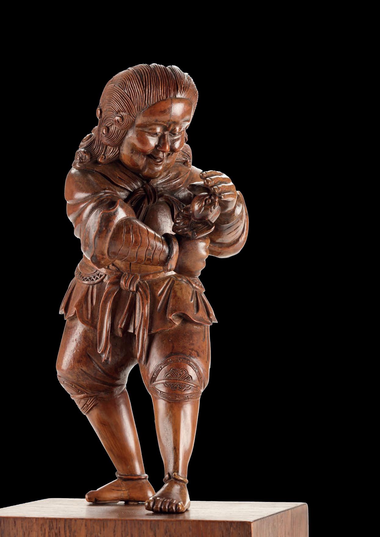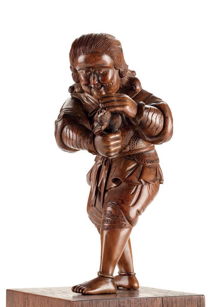 A Japanese boxwood okimono of a Dutchman playing with a bat Edo period, 18th century