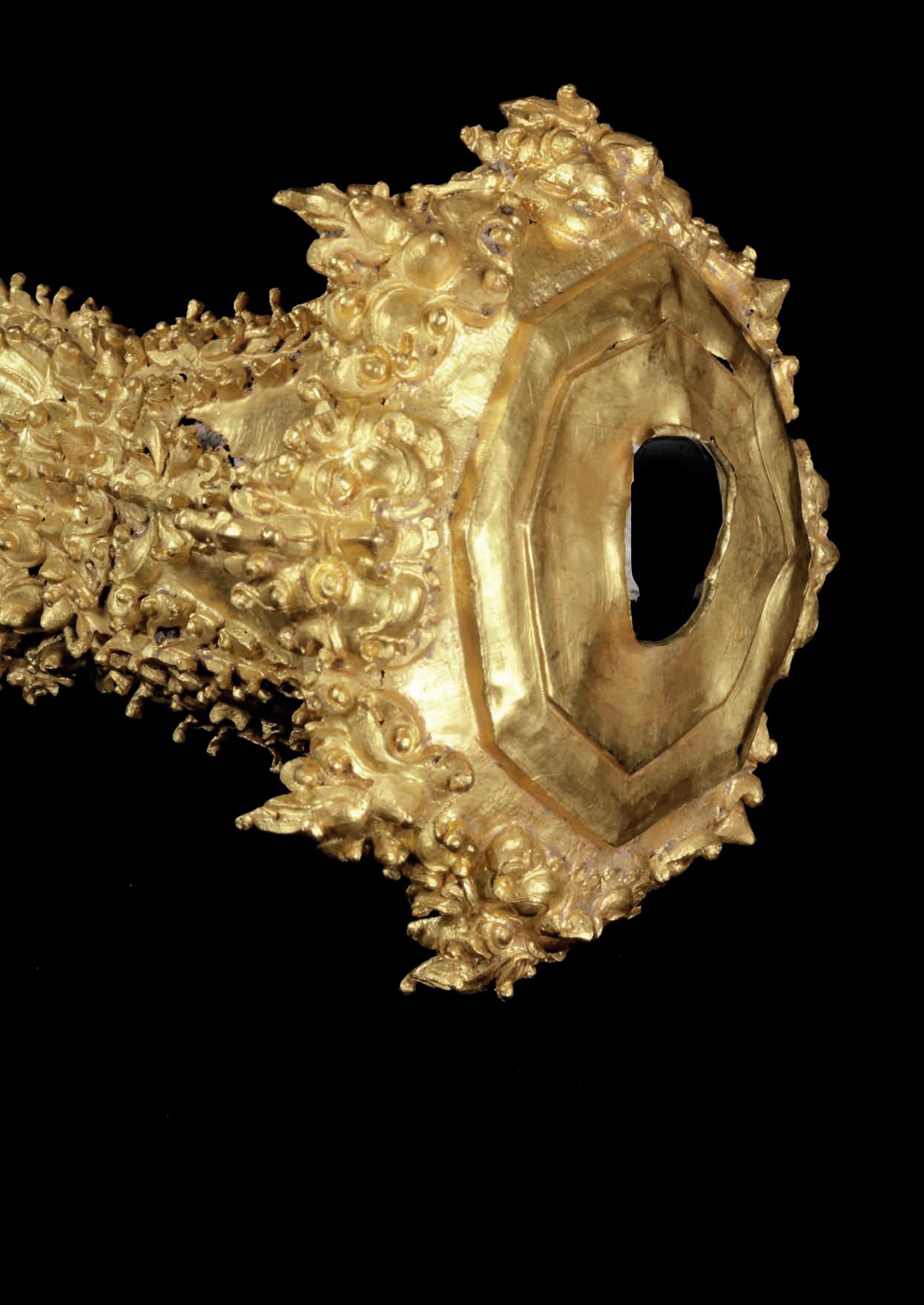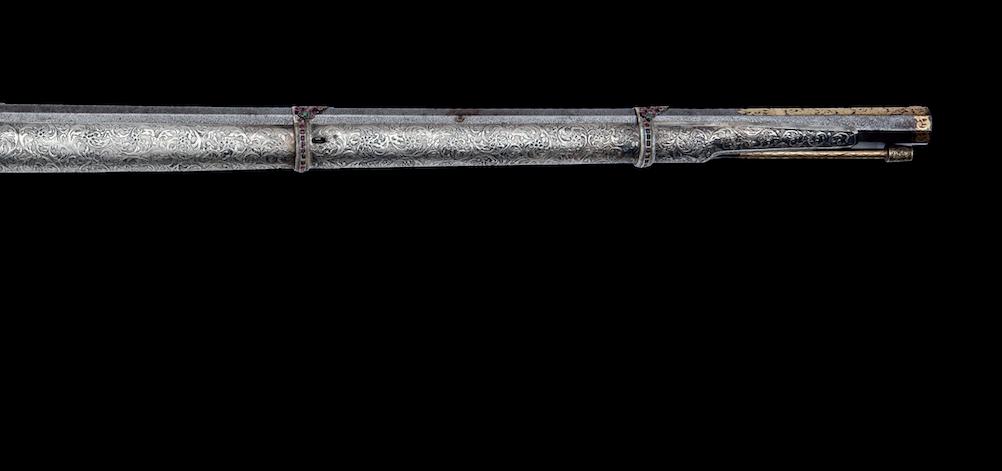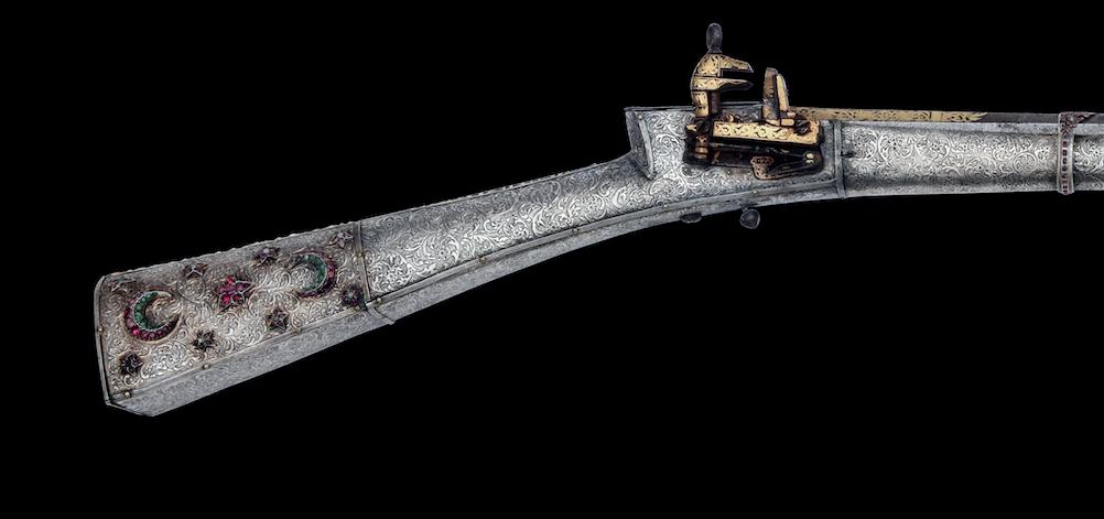 The octagonal watered steel 8-faceted barrel and is damascened at the muzzle and breech with gold arabesques, with a lock with similar gold decoration dated 1038AH (1628 CE). The full stock is entirely covered in silver repoussé with floral scrolls, showing traces of gilding, decorated with two crescent moon appliques and centrally a star applique inset with cabochon-cut rubies, spinels, beryls, and emeralds.