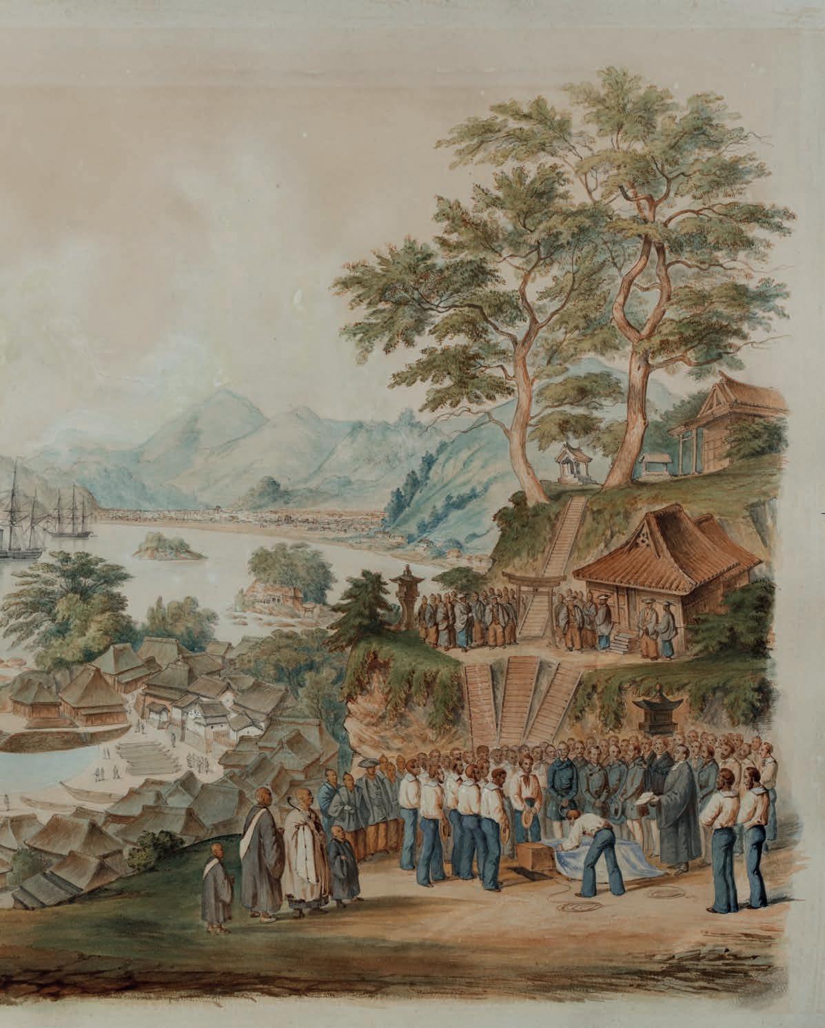 Depicted is the Bay of Shimoda with seven American ships including the two paddle-wheel warships USS Mississippi and Susquehanna. On the Gyokus- en-ji temple grounds on the right is the coffin in the middle with the remains of US marine Robert Williams, ready to be lowered into the grave. Looking on from the left are the Buddhist monks and Japanese officials who joined the first Christian funeral on Japanese soil. Around the grave are US marines, Commodore Perry and some officers and to the right, Reverend George Jones is performing the Christian funeral rites. This was an epoch-making moment in the history of Japan.