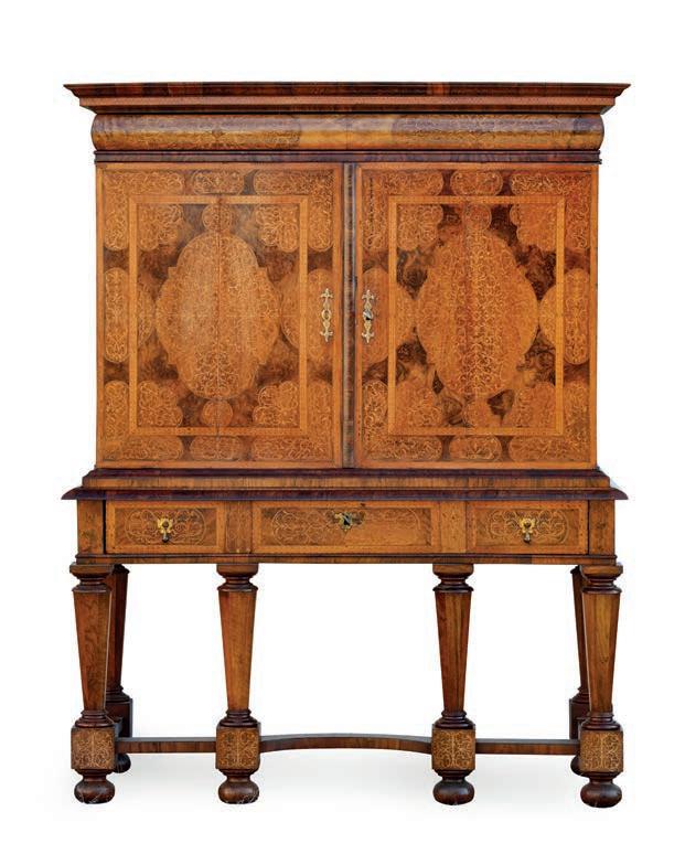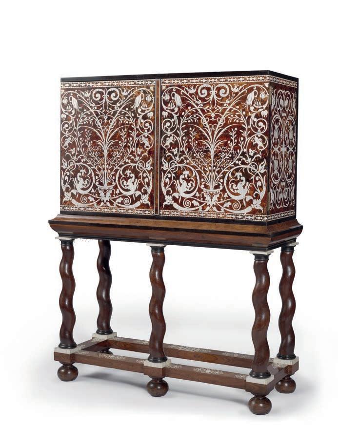 most famous furniture maker. The influence of Jensen is visible in the cabinet present since the marquetry is still in a somewhat English style. Together with the form of the stand, it is an argument for the dating of this cabinet and the possibility of it being one of the earliest works by Van Mekeren. Remarkably, the other two cabinets mentioned earlier have the same stand but differ in marquetry. The Fabergé cabinet shows a more ‘seaweed’ marquetry closely related to the Jensen workshop manner, and the Kingston Lacy cabinet a bolder marquetry closer to Dutch fashion. The cabinet presented here is right in between and therefore shows a certain tranquillity in the composition. Arguably, these cabinets were made shortly after one another after his arrival around 1686-87 and show Van Mekeren losing the influence of Jensen. The Fabergé cabinet was probably made