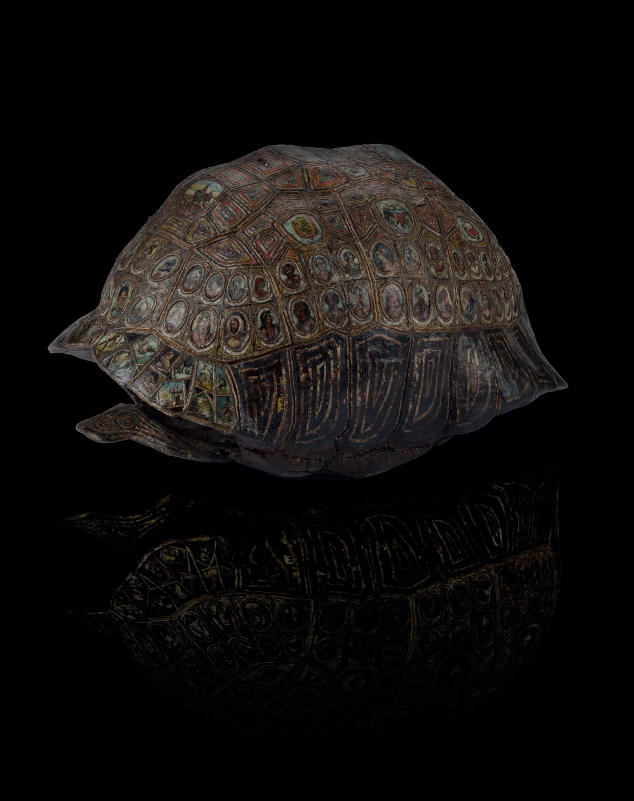 Following the natural forms of the carapace, the artist carved medals all around and painted a surprising portrait gallery depicting the different peoples of the world, amongst them Maori, Sinhalese, Chinese, Tartars, Papuans American Indigenous, Inuit, Persians, Europeans and many more. On the upper part of the shell, coats-ofarms belonging to China, The United States, Chile, Uruguay, Colombia, and Persia. Furthermore, the shell is decorated with miniature copies of famous Romantic paintings, and images of nature and men and with geometric patterns in polychrome and gold. An approximate globe map sits on the final, slightly rounded part of the shell.