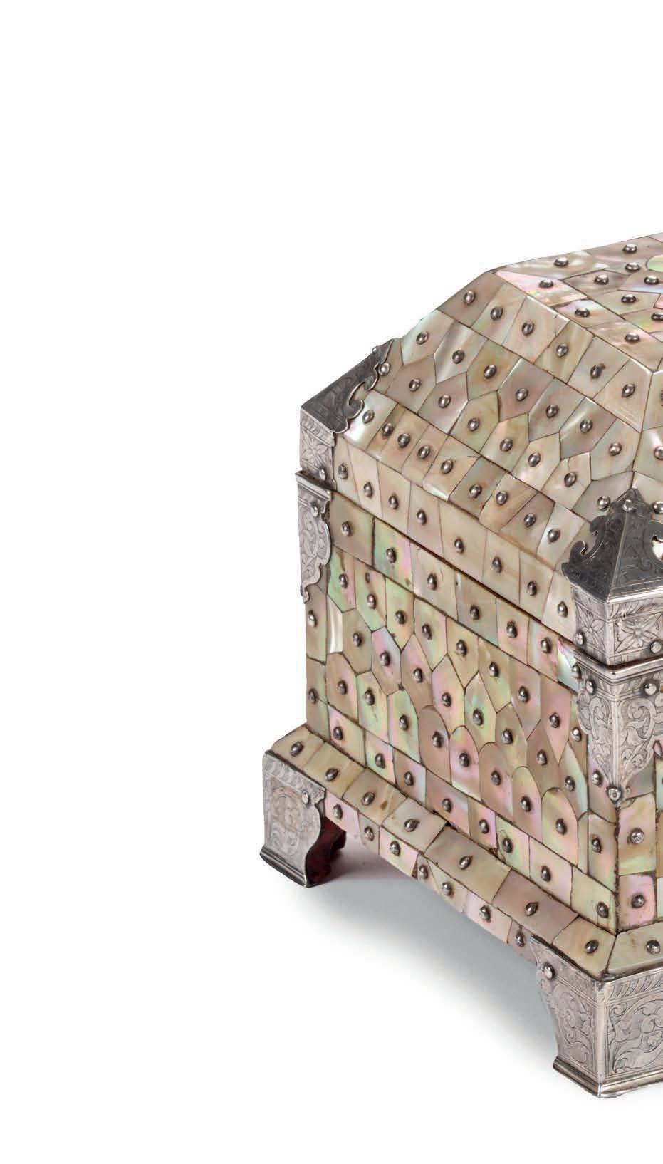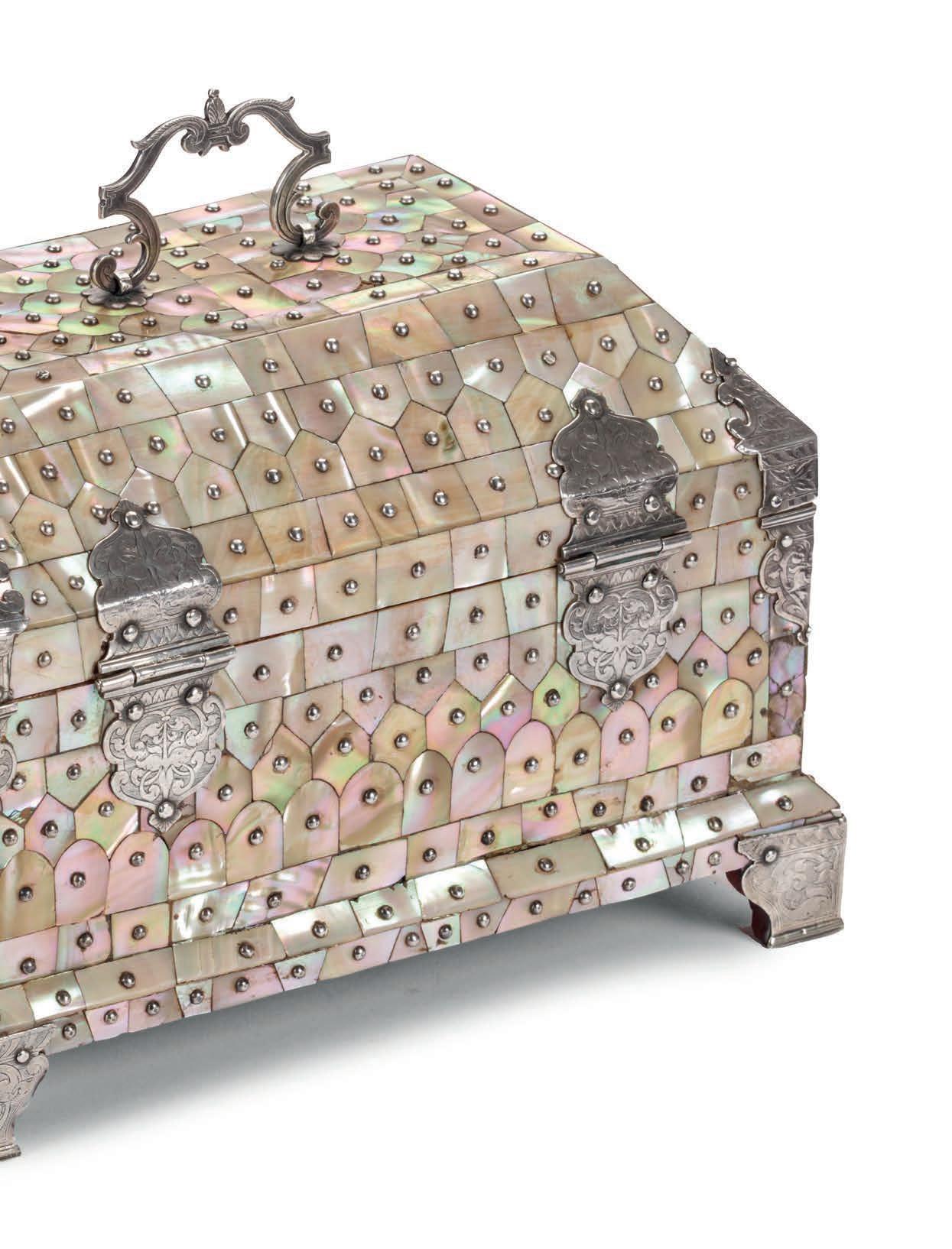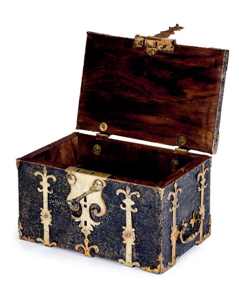 Throughout the late 17th and early 18th century English and Dutch craftsmen ordered the novelty material to cover decorative items such as boxes, knife skins and shaving kits. It was regarded as one of the most luxurious materials used on objects, making the present coffre fort, probably owned by a high official or nobleman, priceless.