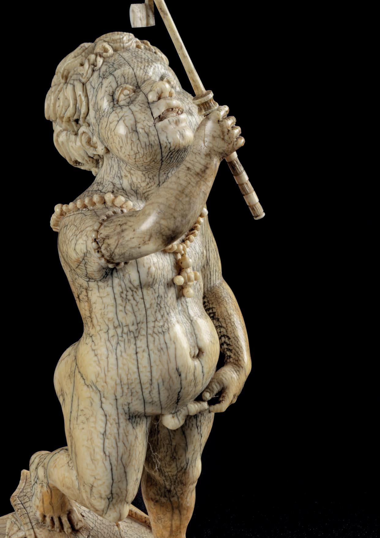 This figure in ivory seems to be full of iconological meanings. With the bow and arrows it is an Amor but since the bow, the quiver of arrows and one single arrow are laying on the ground together with a shield, they may symbolize unsuccesfull or fended off love. The Amor playing with his penis and blowing a whirligig together may be symbols of the fickleness and transitoriness of love. The chain with cross around his neck is a Roman Catholic symbol and may point to a Catholic country of origin, perhaps South Germany or Flanders.